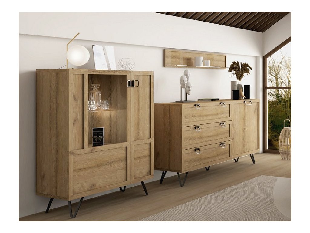 CASA 75099 Obývací sestava v nadčasovém provedení. Korpus je vyroben z přírodní dýhy v barvě dub artisan, dvířka jsou vyrobeny z masivu v provedení dub artisan olejovaný. Sestava se skládá z těchto položek (Š x V x H cm) - vitrína nízká (95 x 124 x 42 cm), závěsná police (120 x 21 x 21 cm) a komoda (140 x 89 x 42 cm). Součástí vitríny je také LED osvětlení. Úchyty a nožky jsou kovové v barvě černá mat. Dvířka disponují systémem tichého dovírání. Dodáváme již ve smontovaném stavu.