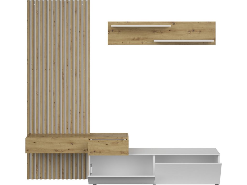 CASA 94001 Obývací stěna se bude hodit zejména do obývacího pokoje zařízeného do moderního či skandinávského stylu. Prezentovaná nábytková sestava je kombinací estetického designu a funkčnosti. Stylový lamelový panel bude ozdobou každého interiéru a skvěle doplňuje stěnu s TV stolkem a policí. LTD o tloušťce 16 mm a 22 mm, zadní část nábytku je vyrobena z dřevovláknité desky o tloušťce 3 mm, panty Hettich, HAFELE celovýsuvná kuličková vedení, plastové nohy, bezúchytový systém "PUSH TO OPEN". Barevné provedení - bílá mat/dub Artisan. Dodáváme v demontovaném stavu.