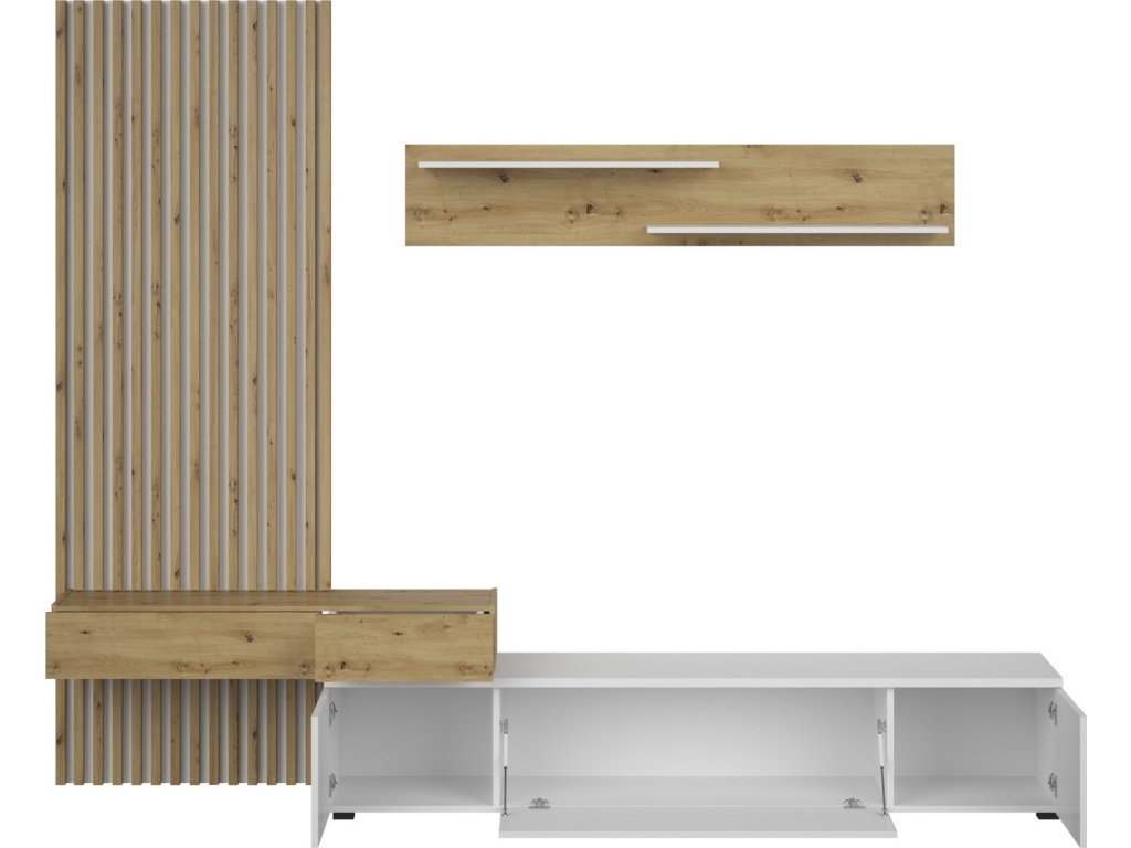 CASA 94001 Obývací stěna se bude hodit zejména do obývacího pokoje zařízeného do moderního či skandinávského stylu. Prezentovaná nábytková sestava je kombinací estetického designu a funkčnosti. Stylový lamelový panel bude ozdobou každého interiéru a skvěle doplňuje stěnu s TV stolkem a policí. LTD o tloušťce 16 mm a 22 mm, zadní část nábytku je vyrobena z dřevovláknité desky o tloušťce 3 mm, panty Hettich, HAFELE celovýsuvná kuličková vedení, plastové nohy, bezúchytový systém "PUSH TO OPEN". Barevné provedení - bílá mat/dub Artisan. Dodáváme v demontovaném stavu.
