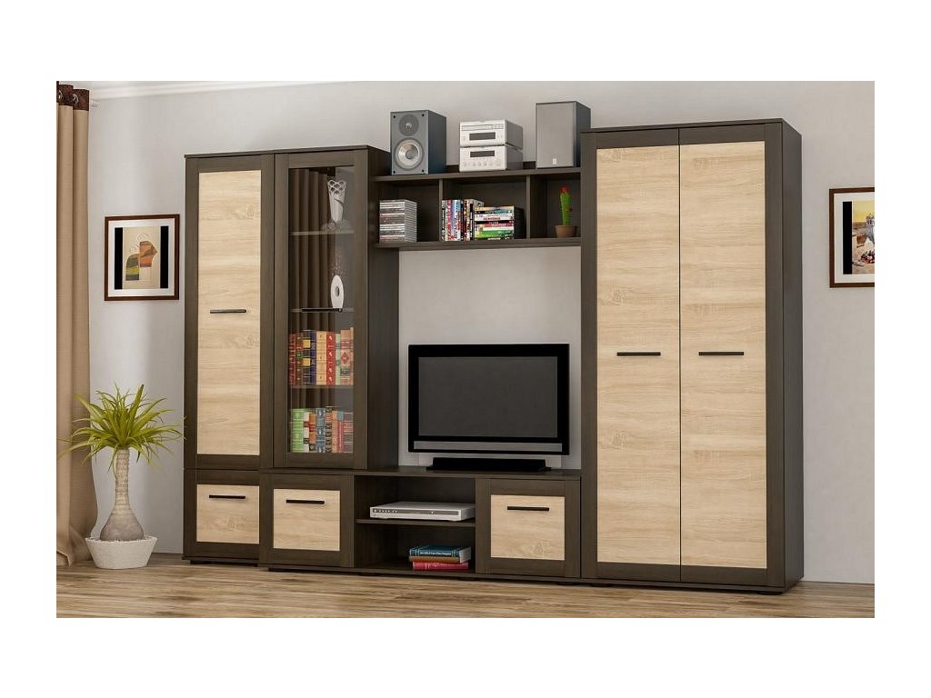 CASA 97050 Sestava do obývacího pokoje v moderním provedení je vyrobena z kvalitní LTD desky v barevné kombinaci wenge/dub sonoma. Sestava se skládá z televizního stolku, nad kterým je umístěna police. Po obou stranách jsou vysoké skříně s policemi, kdy jedna z nich je prosklená a slouží jako vitrína. Úchyty jsou kovové. Dodáváme v demontovaném stavu.