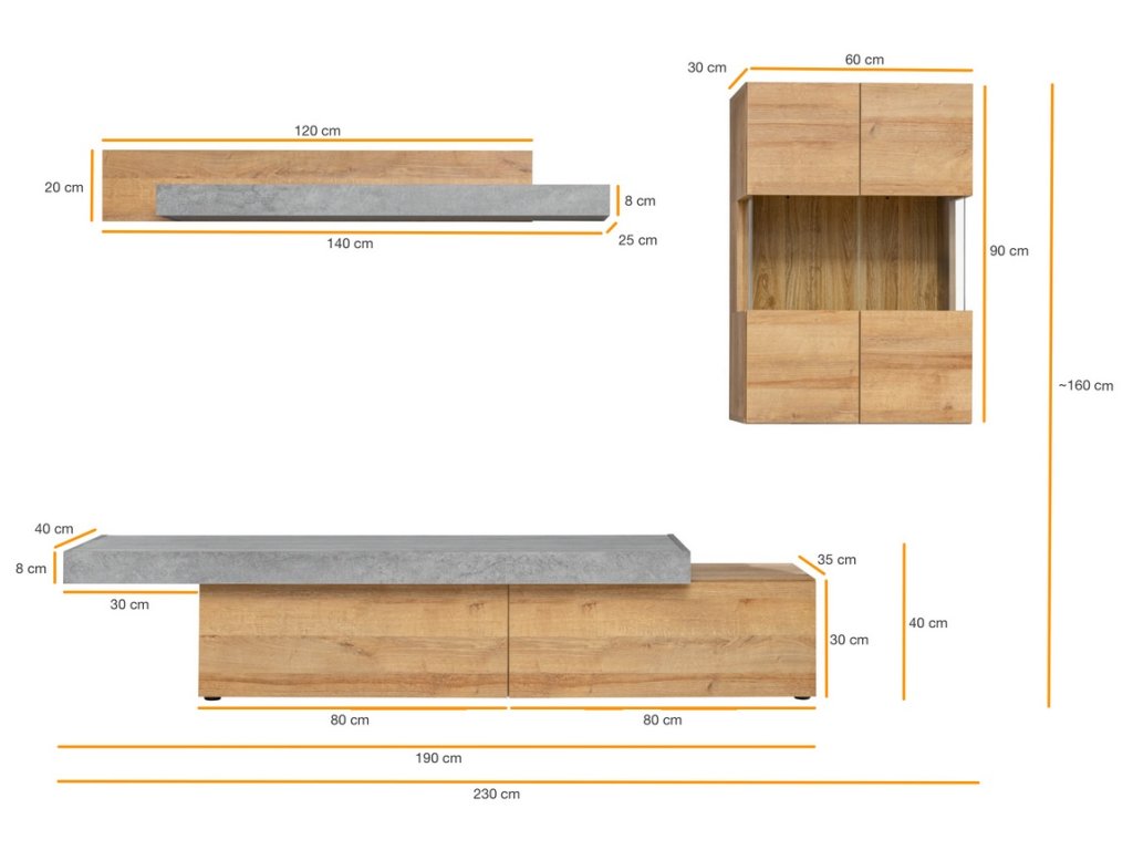 Elegantní obývací stěna CAVIA v dekoru dub riviera doplněna šedým betonem. Stěna je skvěle řešená do malého prostoru. Klade důraz na funkčnost jednotlivých komponentů, navíc se bude jednoduše kombinovat s ostatním nábytkem. Pro naladění příjemné atmosféry je součástí LED osvětlení. Dodávané v demontu. CASA 58003