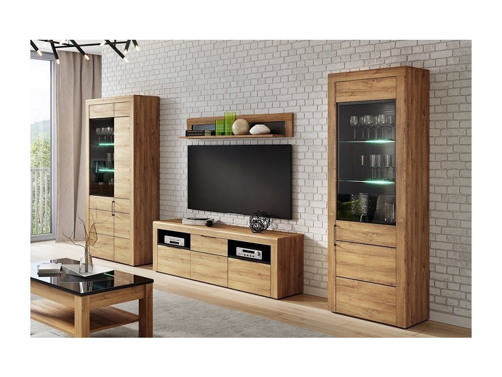 Exkluzivní kolekce KAMA v dekoru dub camargue v kombinaci s černou. Obývací sestava, která zaujme svou elegancí vzhledu přírodního dřeva. Zadní stěna vitríny je z viditelné strany drážkovaná, dveře jsou prosklené a je možné je namontovat na pravou nebo levou stranu. Úchyty jsou kovové černé. Nožky jsou z plastu v černé barvě. LED osvětlení není součástí, ale je možnost jeho dokoupení. Sestavu lze doplnit komponenty z řady KAMA ve stejném designu. Dodávané v demontu. CASA 75015