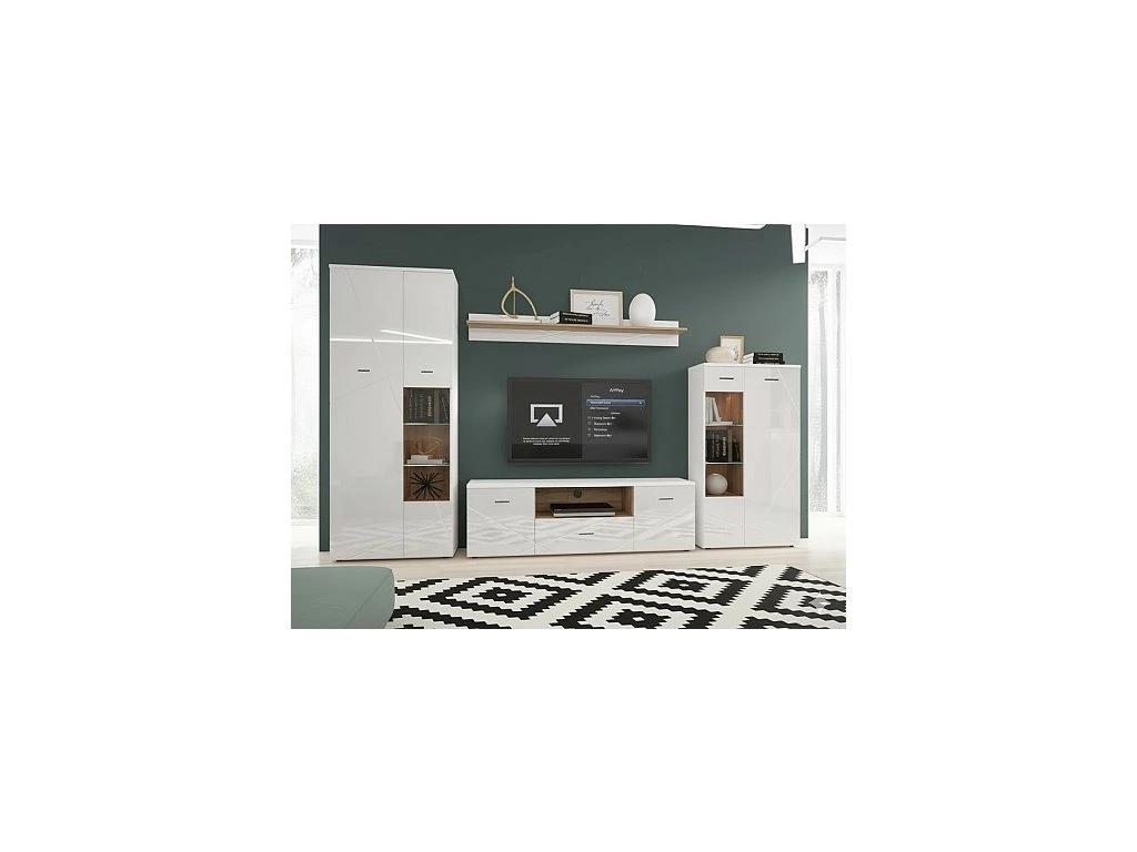 Elegantní obývací stěna představuje moderní řešení pro každý interiér. Kombinace bílé barvy s vysokým leskem a přírodního dekoru dubu působí čistě a nadčasově. Stěna nabízí bohatý úložný prostor v podobě vysoké skříně, prosklených vitrín a komody pod TV. Díky závěsné polici získáte místo na dekorace či knihy. Prosklené části lze doplnit LED osvětlením pro ještě atraktivnější vzhled.