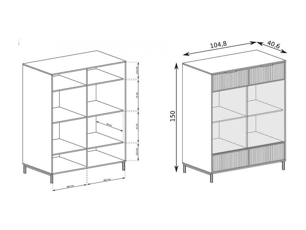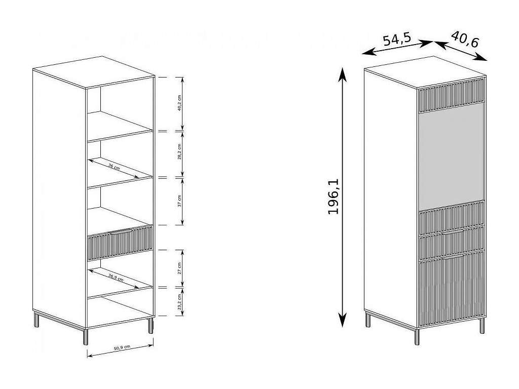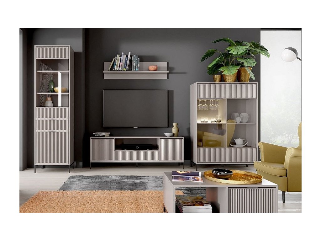 Nábytek je zdoben vzorem na čelních stranách v podobě frézovaných drážek. Všechny kusy nábytku z této kolekce stojí na černých kovových nožkách. Jednoduché a funkční tvary se hodí do obývacího pokoje, ložnice i jídelny.