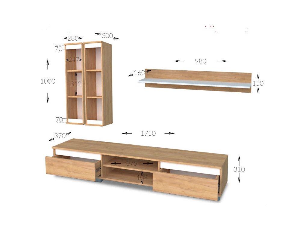 CASA 83071 Levná obývací stěna v moderním barevném provedení se stane výrazným prvkem každé místnosti. Kombinace barvy dub kraft tabaco s dekoračními lištami z MDF satin barvy. Nábytek je vyroben z kvalitního lamina hraněného melaninem. Sestava se skládá z ( šířka/hloubka/výška ) - televizní stolek se 2 zásuvkami ( 175,2 x 37 x 31 cm ), 2x závěsná skříňka 1-dveřová ( 28 x 30,6 x 100,2 cm ) a police ( 98,2 x 16 x 15 cm ). Tato stěna se prodává jako sestava, jednotlivé díly nelze koupit zvlášť. Dodáváme v demontovaném stavu.