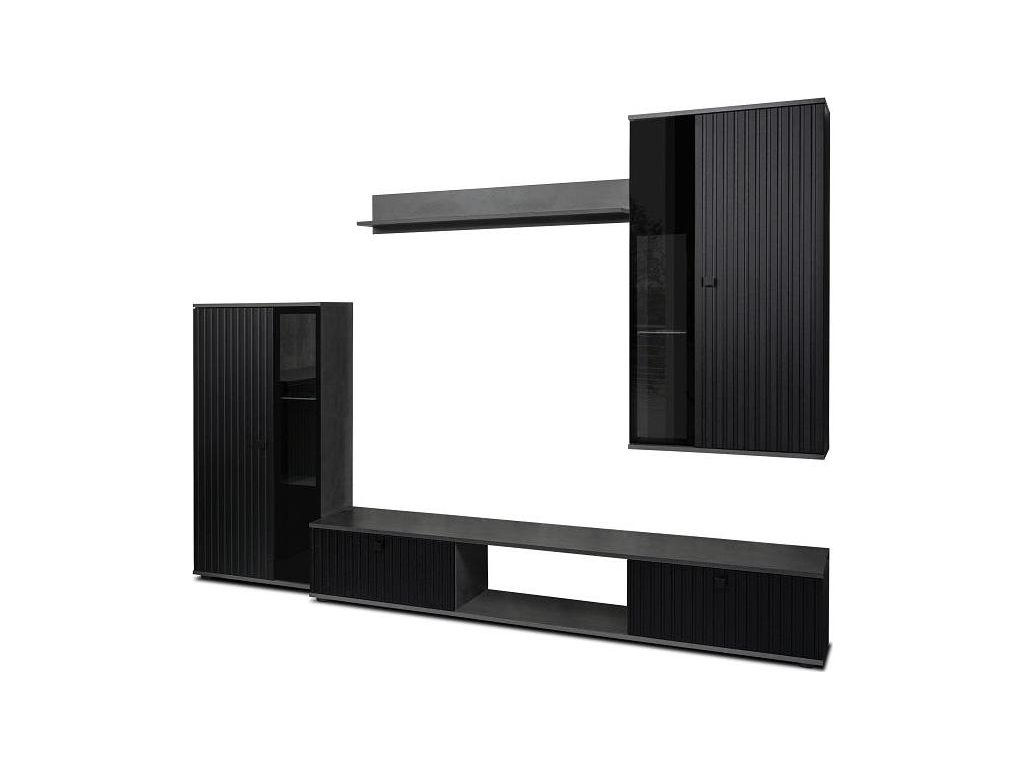 CASA 87009 Moderní obývací stěna SALSA. Nábytek je vyroben z kvalitního lamina. Sestava se skládá z vitríny 59 x 31 x 115, TV stolku 176 x 40 x 28, závěsné vitríny 59 x 31 x 113 a police 102 x 18 x 16 cm. Obývací stěna je v barvě černá/matera. Sklo ve vitríně je čiré. Tato stěna se prodává jako sestava, jednotlivé díly nelze koupit zvlášť. Možnost doobjednání komody nebo LED osvětlení. Dodáváme v demontovaném stavu.