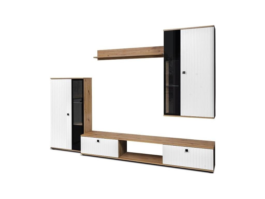 CASA 87009 Moderní obývací stěna, která si zakládá na nejnovějších trendech bydlení. Nábytek je vyroben z kvalitní desky LTD v barevném provedení bílá/dub artisan. Sestava se skládá ze dvou vitrín, televizního stolku a police a prodává se pouze jako sestava. Prostor pro televizi je - výška 91 cm, šířka 132 cm. Dodáváme v demontovaném stavu.