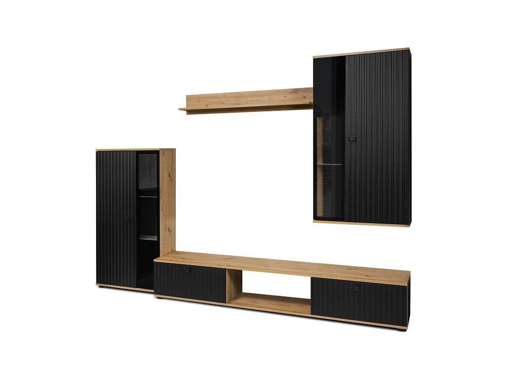 CASA 87009 Moderní obývací stěna, která si zakládá na nejnovějších trendech bydlení. Nábytek je vyroben z kvalitní desky LTD v barevném provedení je černá/dub artisan. Sestava se skládá ze dvou vitrín, televizního stolku a police a prodává se pouze jako sestava. Prostor pro televizi je - výška 91 cm, šířka 132 cm. Dodáváme v demontovaném stavu.