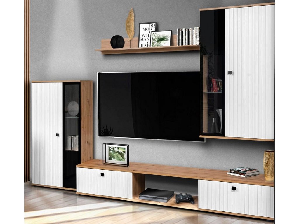 Obývací stěna Silos patří mezi oblíbené modely moderního nábytku. Nabízí dostatek úložného prostoru a je vhodná i do menších pokojů. Stěna je vyrobena z lamina, které je odolné a snadné na údržbu. Ke stěně nabízíme i komodu ve stejném provedení. Všechny prvky této sestavy jsou dodávány v demontu.Součástí je montážní plánek včetně všech potřebných spojovacích materiálů. Cena je uvedena za bytovou stěnu vyobrazenou na úvodní fotografii, bez komody, doplňků a dekorací. LED osvětlení není v ceně sestavy (lze dokoupit zvlášť).