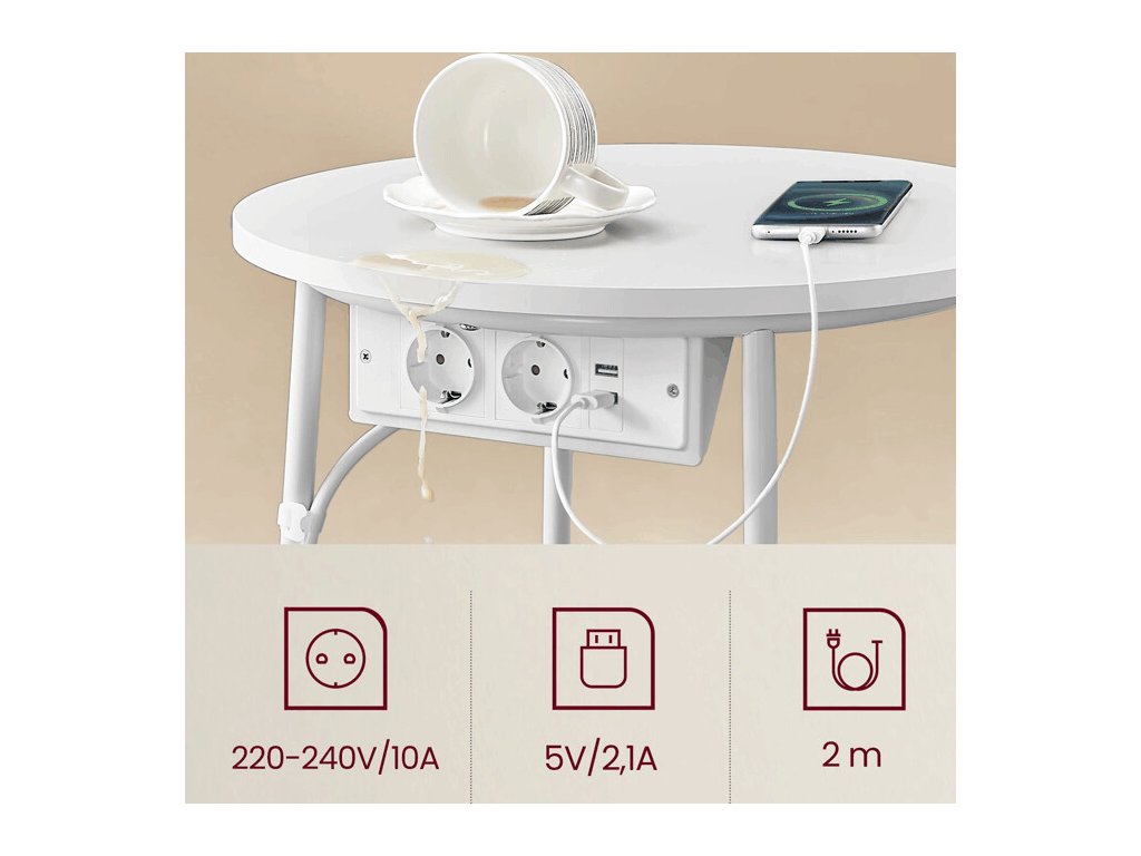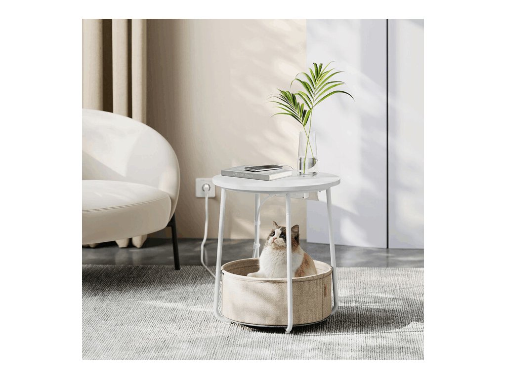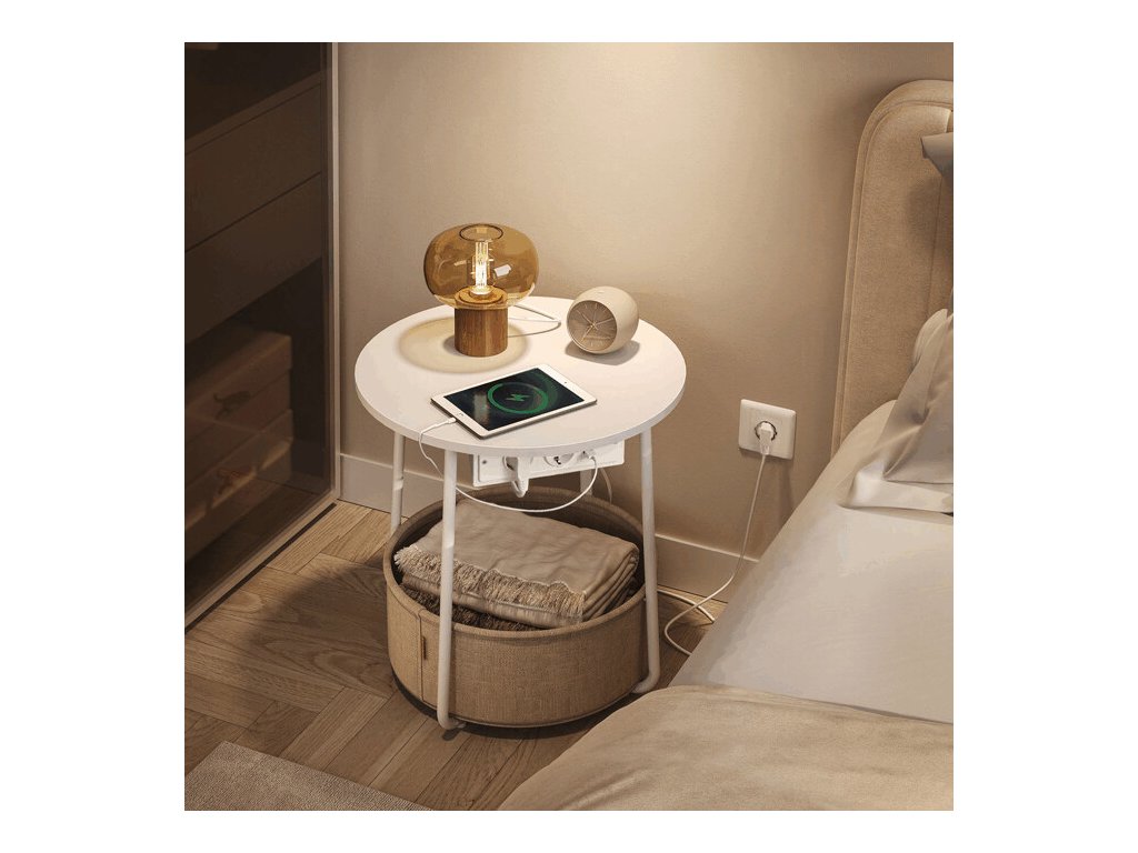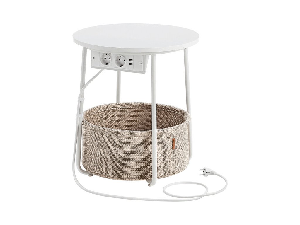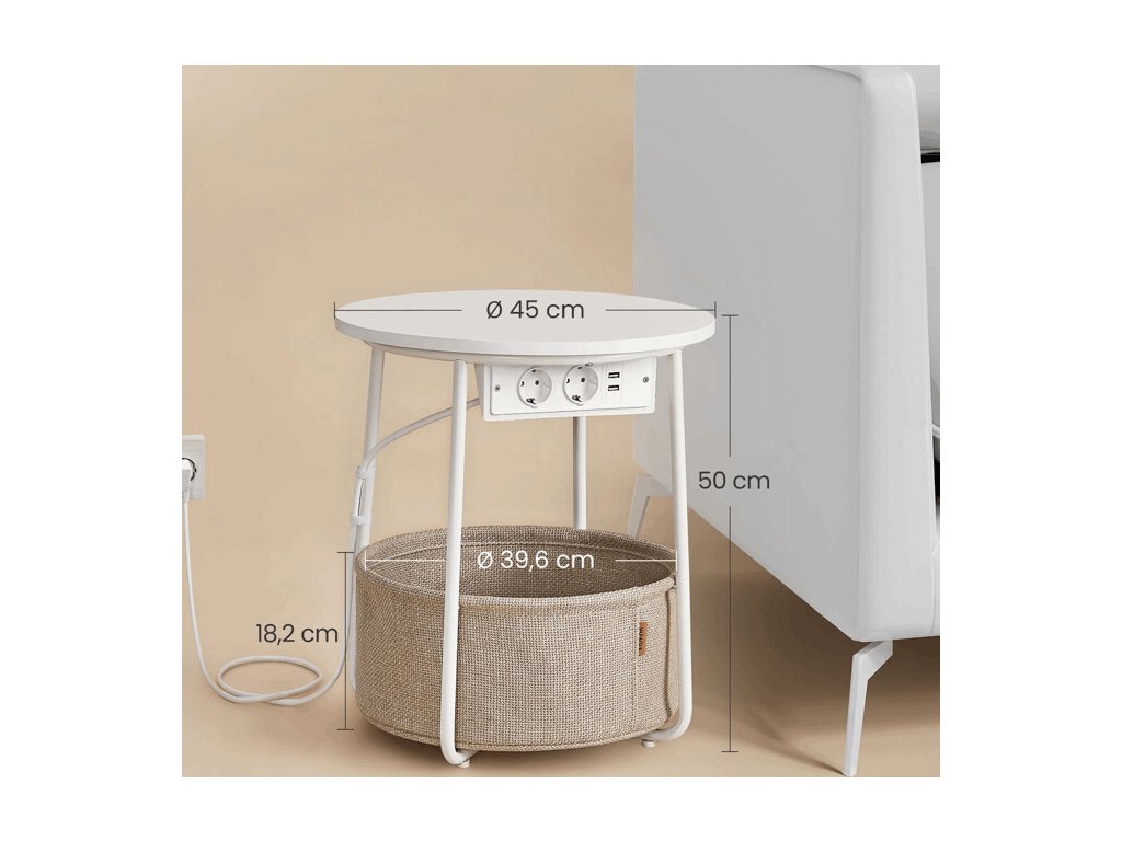 Odkládací stolek s elektrickou zásuvkou a USB porty nabízí praktické řešení pro moderní domácnosti i kanceláře. Kulatá deska o průměru 45 cm je vyrobena z MDF v bílé barvě s hladkým povrchem, který se snadno udržuje. Pevné kovové nohy v bílé barvě zajišťují stabilitu a dlouhou životnost stolku. Pod deskou je umístěn textilní koš v přírodním odstínu, který poskytuje dodatečný úložný prostor pro drobnosti. Integrovaná elektrická zásuvka se dvěma standardními výstupy a dvěma USB porty umožňuje pohodlné napájení elektroniky přímo u stolu, což zvyšuje jeho funkčnost a komfort užívání.