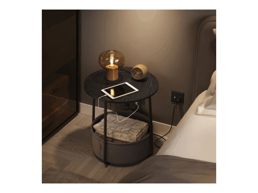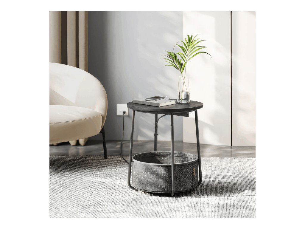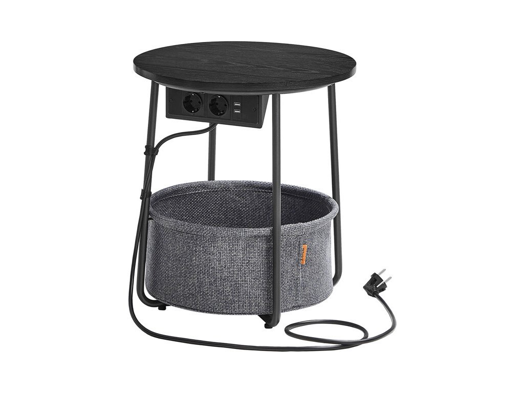 Odkládací stolek značky Autronic kombinuje praktický design s moderními funkcemi. Kulatá deska o průměru 45 cm je vyrobena z MDF s černým dekorem, který snadno zapadne do různých interiérů. Stabilní kovové nohy zajišťují pevnou oporu, zatímco textilní koš pod deskou nabízí úložný prostor pro drobnosti. Součástí stolku je elektrická zásuvka se dvěma standardními výstupy a dvěma USB porty, které umožňují pohodlné nabíjení elektroniky přímo u stolu. Napájecí kabel je připevněn k rámu stolku, což usnadňuje organizaci prostoru a zabraňuje zamotání. Výška stolku je 50 cm, což jej činí vhodným jako přístavný nebo odkládací stolek v obývacím pokoji či pracovně.