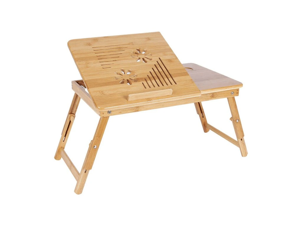 Odkládací stolek na notebook z bambusu nabízí praktické a estetické řešení pro práci i odpočinek. Deska je rozdělena na dvě části, z nichž jedna je nastavitelná do různých úhlů a opatřená větracími otvory pro lepší chlazení zařízení, doplněná o zarážku proti sklouznutí. Druhá část slouží jako pevná plocha s výřezem pro umístění šálku nebo drobných předmětů. Pevné sklápěcí nohy umožňují snadné přenášení a skladování, přičemž bambusové provedení zajišťuje stabilitu a přírodní vzhled. Stolek je ideální pro použití v posteli, na pohovce nebo na podlaze, přičemž jeho rozměry a nosnost odpovídají běžným potřebám domácího i kancelářského využití.