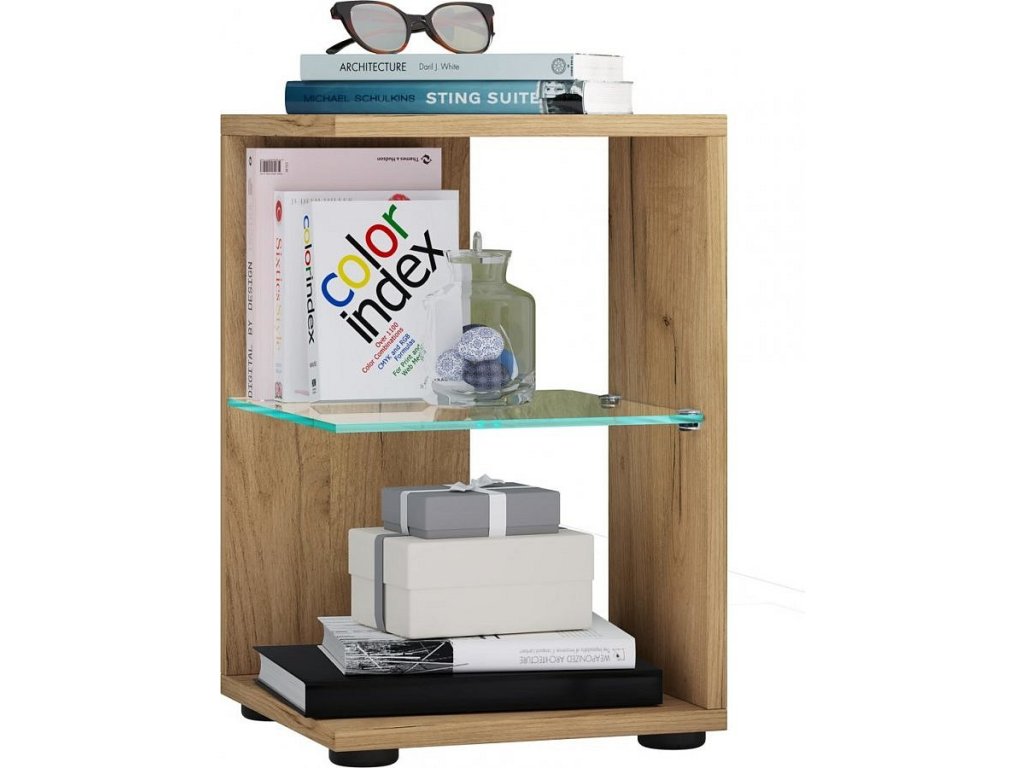 Hlavní vlastnosti: - Speciální kus nábytku do každé místnosti - Kvalitní a stabilní zpracování - Dvě otevřené přihrádky - Elegantní skleněná police - Rozměry cca v. 45 x š. 30 x h. 30 cm. Odkládací stolek „Elani“ je velmi speciální kus nábytku. Designér záměrně navrhl nábytek velmi minimalisticky se skleněným prvkem, díky čemuž je tento odkládací stolek absolutním poutavým prvkem. Možnosti využití jsou téměř neomezené, ať už v obývacím pokoji nebo jako noční stolek v ložnici. VCM se specializuje na design, výrobu a distribuci nábytku s férovým poměrem cena/výkon od 70. let 20. století a již jím ozdobila miliony domácností.
