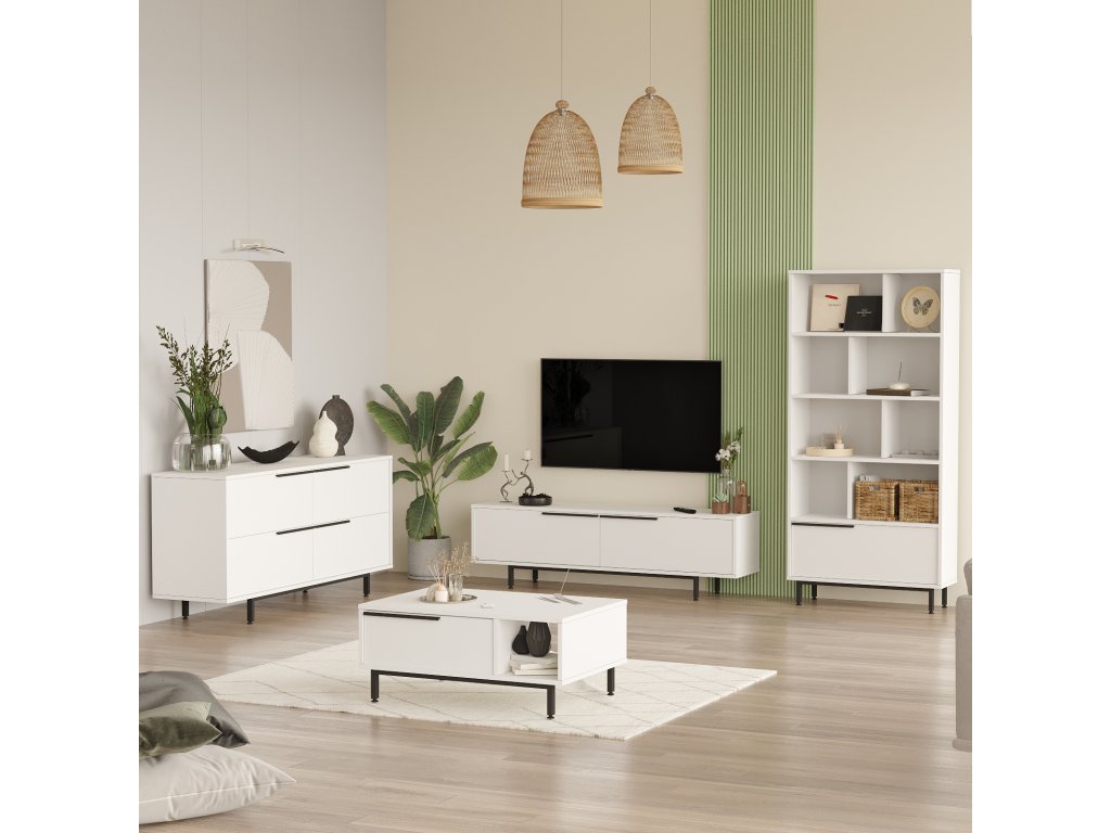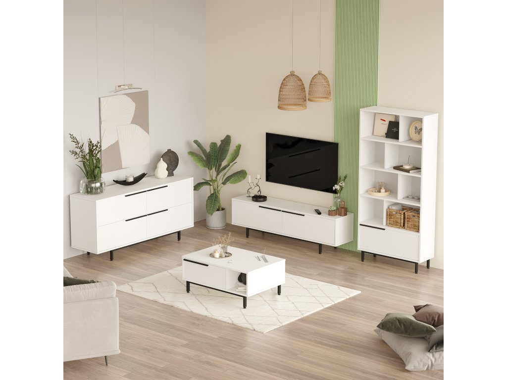 je navržena tak, aby splnila všechny vaše potřeby. Televizní stolek nabízí prostor pro multimediální zařízení, konferenční stolek slouží jako ideální místo pro občerstvení nebo dekorace, prostorná komoda poskytuje úložné místo pro různé předměty a knihovna je perfektním místem pro uložení knih, rostlin nebo dekorací. Díky preciznímu zpracování a modernímu designu se stane dominantou vašeho obývacího pokoje.