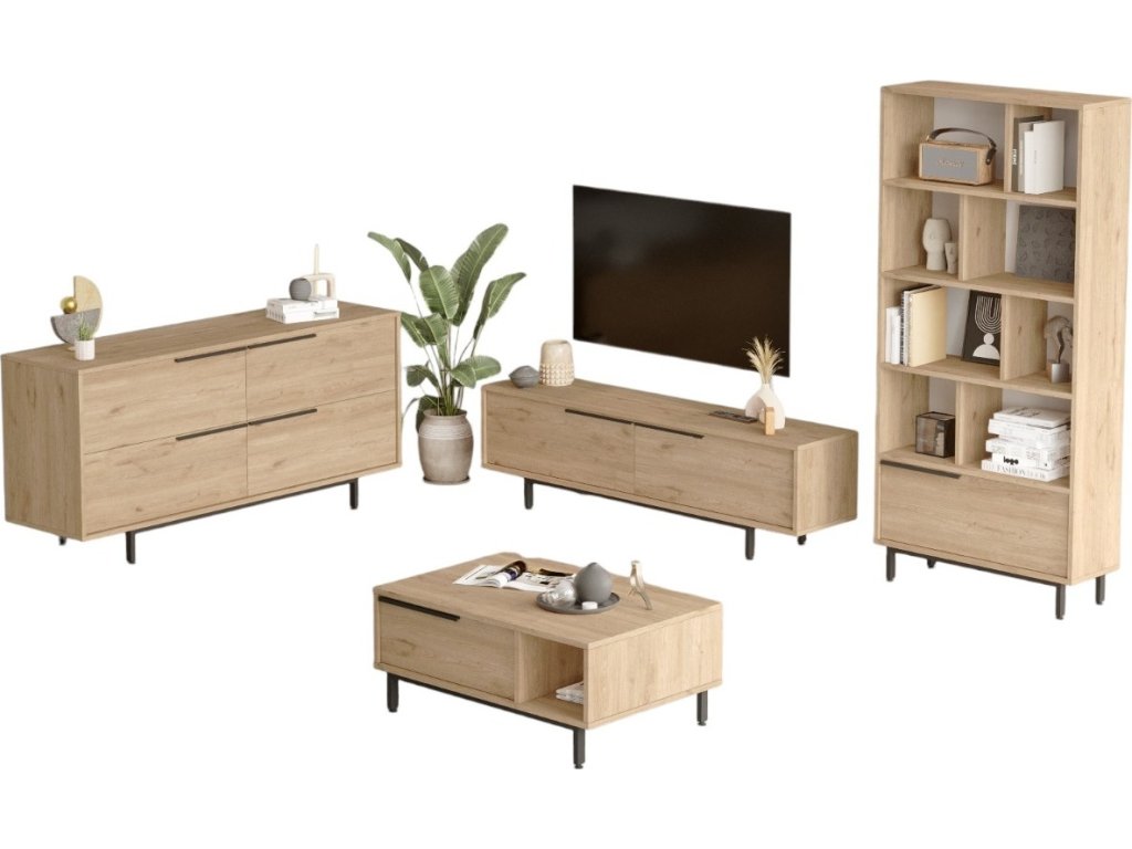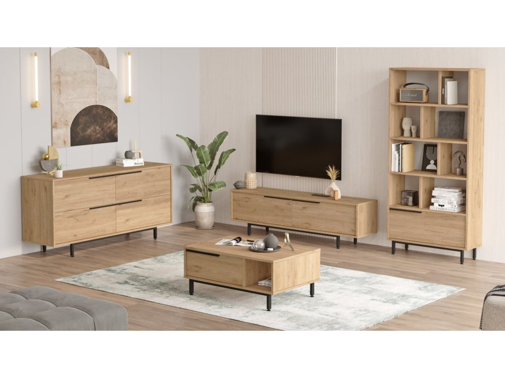 je navržena tak, aby splnila všechny vaše potřeby. Televizní stolek nabízí prostor pro multimediální zařízení, konferenční stolek slouží jako ideální místo pro občerstvení nebo dekorace, prostorná komoda poskytuje úložné místo pro různé předměty a knihovna je perfektním místem pro uložení knih, rostlin nebo dekorací. Díky preciznímu zpracování a modernímu designu se stane dominantou vašeho obývacího pokoje.