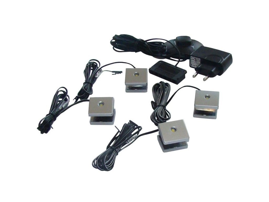 CASA 75001 Osvětlení skleněných polic vitríny obsahuje: 4 x světelný bod (neutrální, bílé, LED), 3 směry šíření světla - nahoru, dolů a na polici, 1 x transformátor, dotykový spínač pro desku.