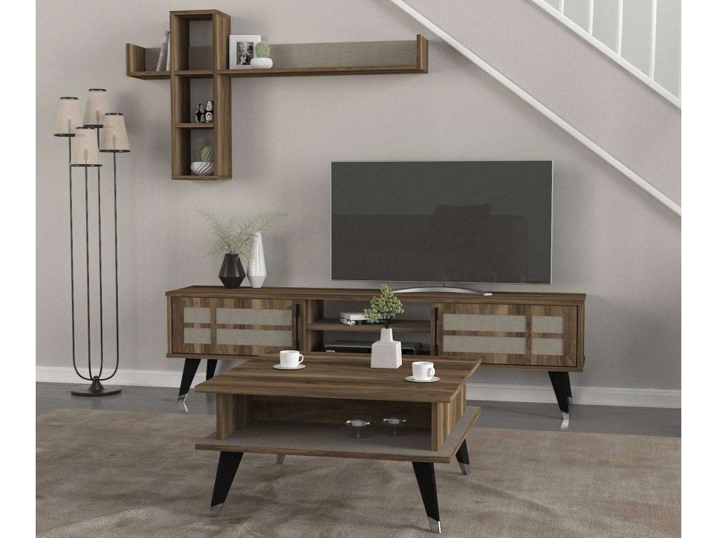 Představujeme konferenční stolek, který přináší do vašeho obývacího pokoje eleganci a funkčnost. Tento stylový nábytek v kombinaci ořechové barvy a textilního vzhledu je navržen tak, aby poskytoval praktické a estetické řešení pro vaše potřeby.