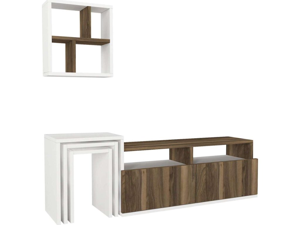 - Dodatečné informace: Odkládací stolky jsou vsunuty dovnitř TV stolku, což umožňuje efektivní využití prostoru. Produkt je dodáván v demontovaném stavu, což usnadňuje transport a montáž.