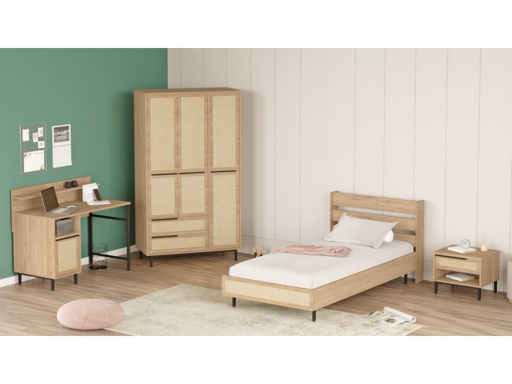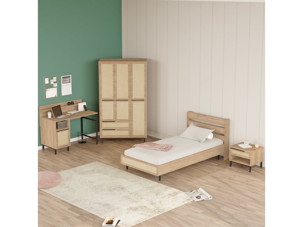 kombinuje pohodlí a praktičnost. Postel poskytuje komfortní místo pro spánek, noční stolek je ideální pro lampičku nebo knihy, šatní skříň nabízí dostatek úložného prostoru pro oblečení a psací stůl zajišťuje ideální pracovní prostor pro studium nebo tvoření. Díky promyšlenému designu je tato sestava skvělým řešením pro organizovaný a stylový dětský pokoj.