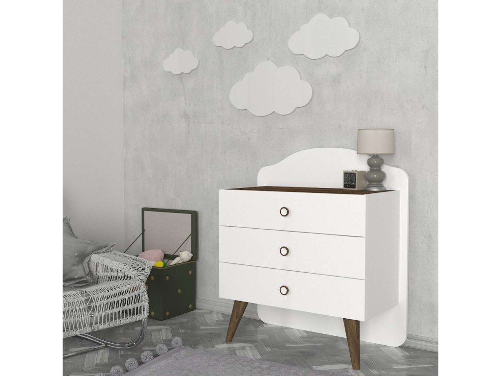 Komoda se vyznačuje elegantním bílým provedením, které snadno zapadne do jakéhokoliv interiéru. S třemi prostornými zásuvkami poskytuje dostatek úložného prostoru pro vaše věci, což vám pomůže udržet váš obývací pokoj uspořádaný a čistý.