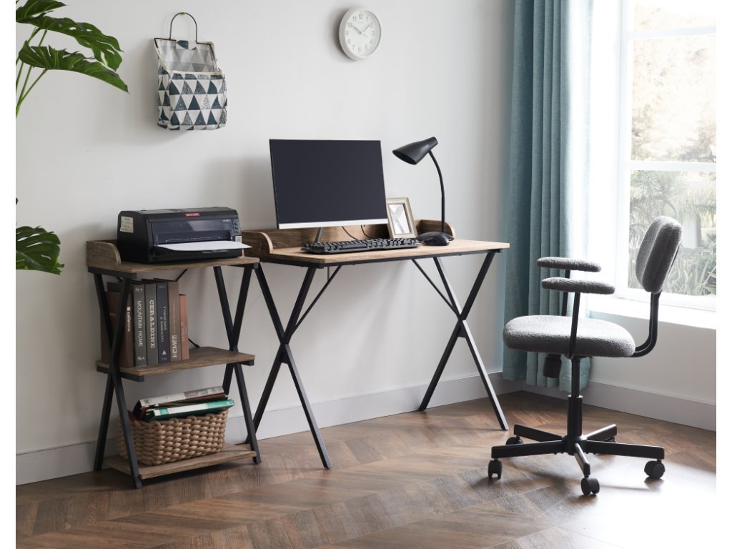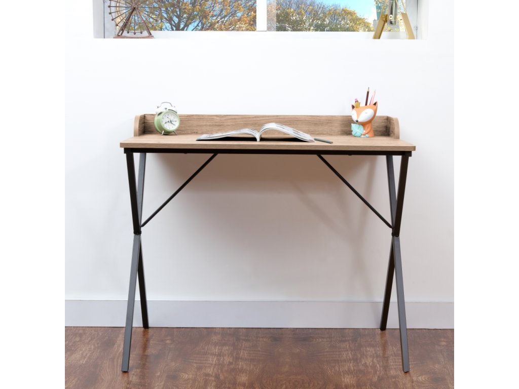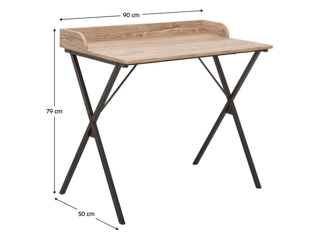 Materiál deska: DTD laminovaná/kov Barva: dub/černá Rozměry (ŠxHxV): 90x50x79 cm Tloušťka materiálu: 1,5 cm Nosnost: 40 kg Vyvýšená zadní část Moderní design Univerzální využití Pracovní/psací stůl Dodáváno v demontu