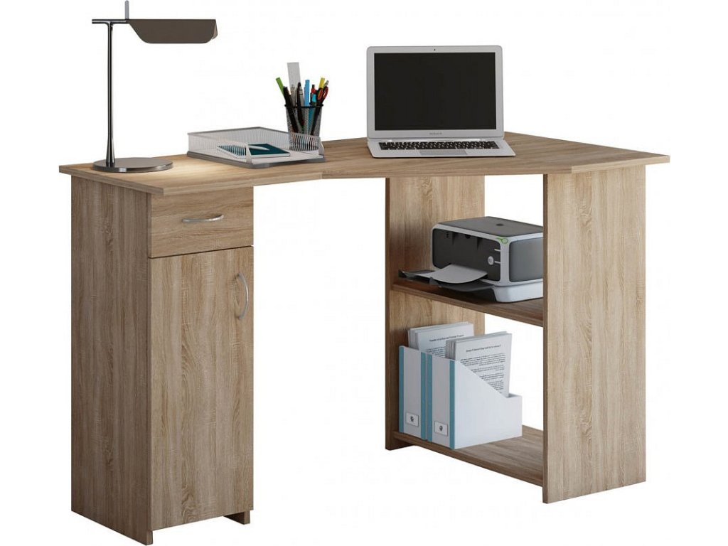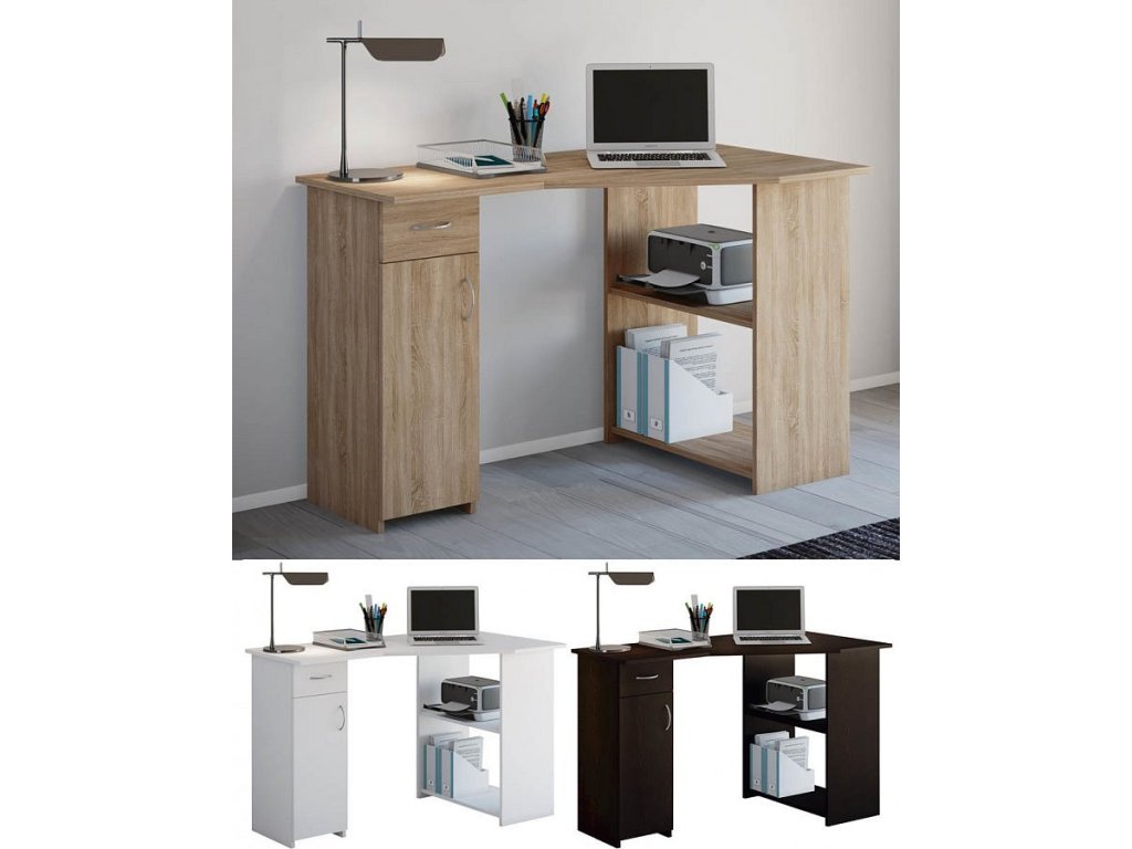 Rohový počítačový stolek se spoustou úložného prostoru. Nabízí velkorysou pracovní plochu, 1 zásuvku, uzavíratelnou skříňku a 2 velké otevřené přihrádky s dostatkem místa na šanony, dokumenty, tiskárnu a další.