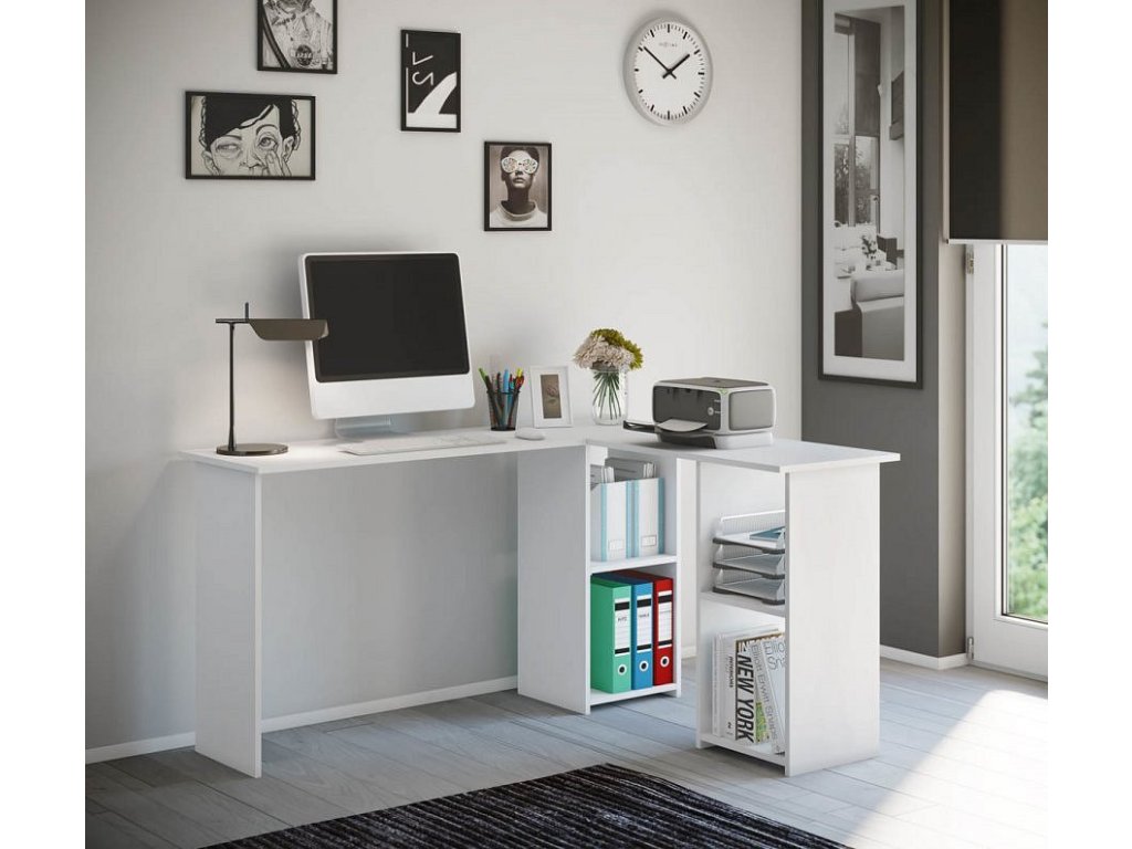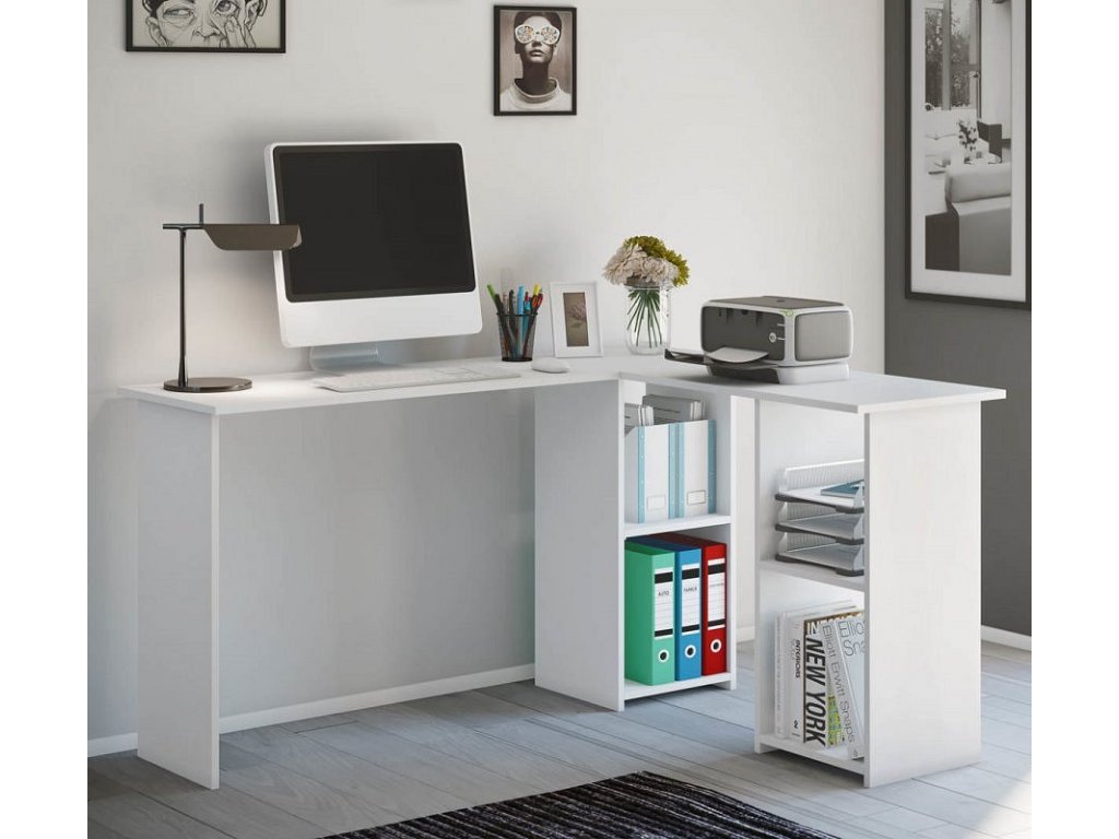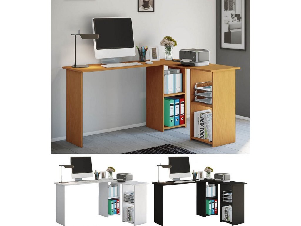 Rohový počítačový stolek se spoustou úložného prostoru. Nabízí dvě pracovní plochy a 4 velké otevřené přihrádky s dostatkem místa na šanony, dokumenty, tiskárnu a další.