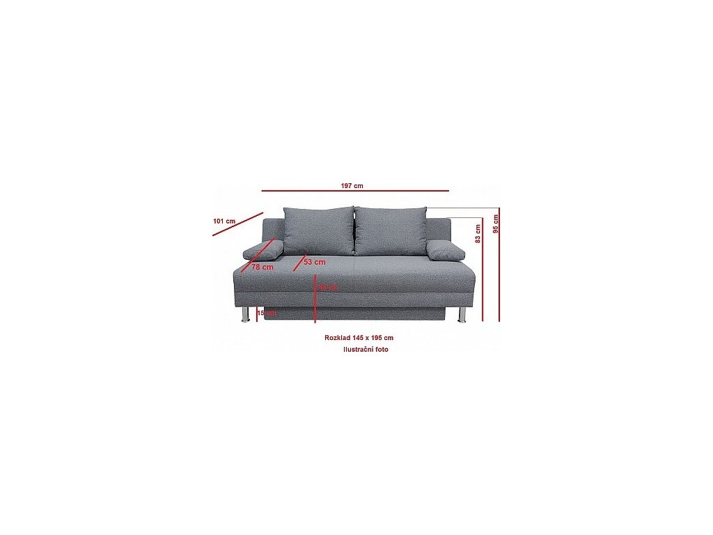 Rozkládací systém je navržen tak, abyste během několika vteřin vytvořili prostorné lůžko o rozměrech 145 × 195 cm, aniž byste museli pohovku odtahovat od zdi. Tím šetříte místo i čas. Hloubka sedu je 53 cm s polštáři a 78 cm bez nich, což zajišťuje pohodlné sezení přes den i kvalitní spánek v noci.