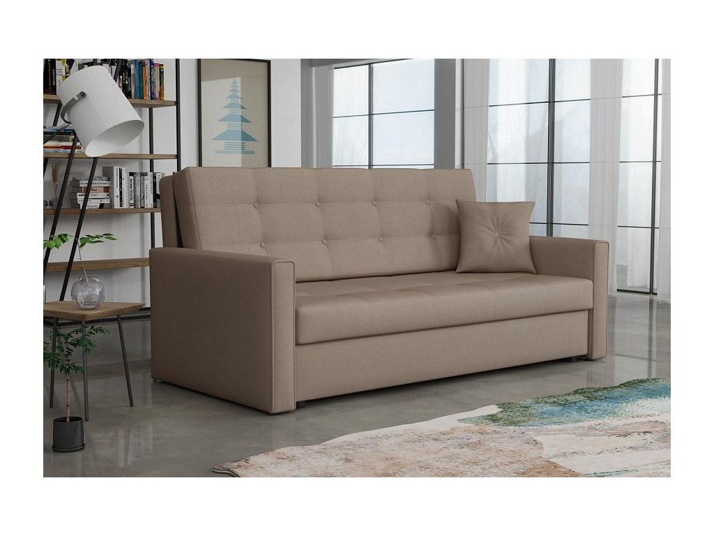 Rozkládací pohovka Vivian je díky svým rozměrům vhodná i do menších pokojů. Je vyrobena v jednoduchém a zároveň elegantním designu, který se hodí do všech interiérů. Můžete ji umístit do obývacího, dětského, studentského, nebo hostinského pokoje. Jednoduchým rozložením pomocí automatu, získáte lůžko k příležitostnému přespání Vaší návštěvy. Výplň sedáku tvoří vlnité pružiny v kombinaci s PUR pěnou. Pohovka je potažena kvalitní látkou a nabízíme ji v několika trendy odstínech. Pohovka disponuje i nepostradatelným úložným prostorem, který využijete např. na deku a polštář. V ceně pohovky je 1 dekorační polštář. Ostatní vyobrazené dekorace nejsou v ceně.
