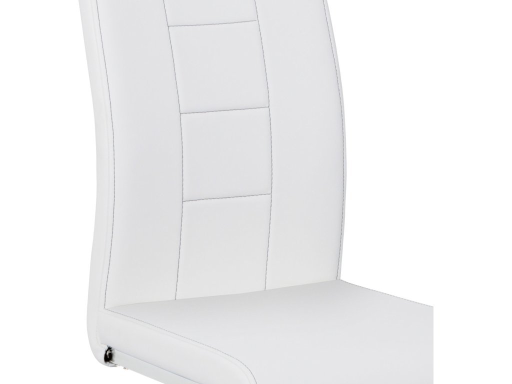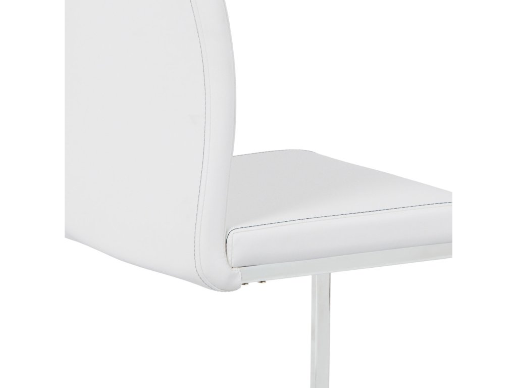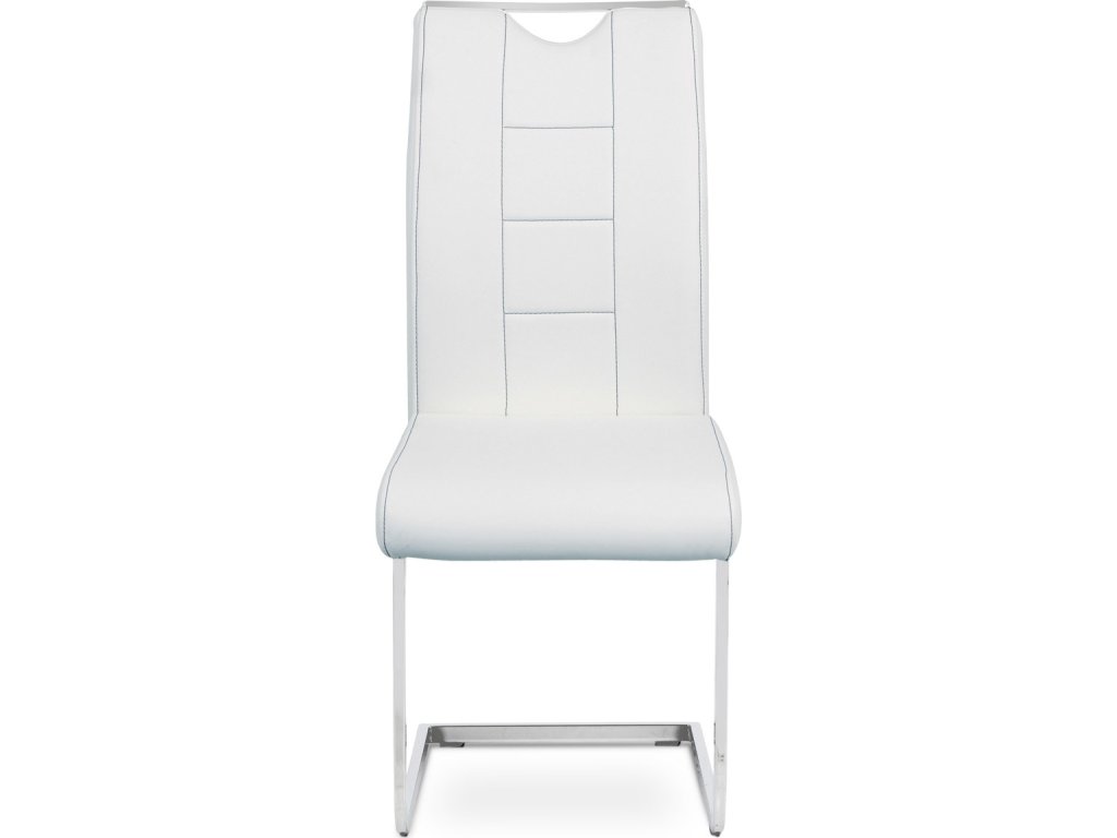 Jídelní židle v bílém provedení z ekokůže nabízí moderní design s praktickou funkcí pohupování, která zvyšuje komfort při sezení. Čalounění z kvalitní ekokůže je snadno udržovatelné a příjemné na dotek, zatímco pevná kovová podnož s chromovanou povrchovou úpravou zajišťuje stabilitu a dlouhou životnost. Opěradlo je ergonomicky tvarované s decentním prošitím a horním výřezem pro snadné přenášení. Absence područek umožňuje snadné zasunutí židle pod stůl a šetří prostor v jídelně. Židle je vhodná pro každodenní použití a kombinuje funkčnost s elegantním minimalistickým vzhledem.