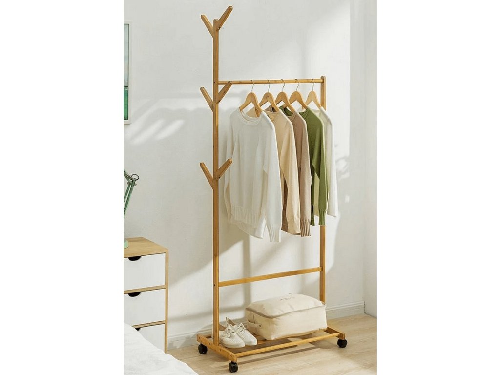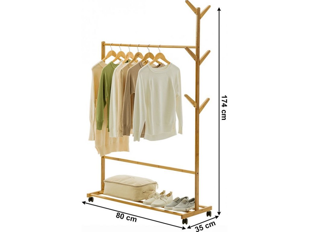 Materiál: bambus Farba: bambus Rozmery (ŠxHxV): 80x35x174 cm Nosnost: 15 kg Vešiaková tyč Spodná polica Šesť háčikov Štyri kolieska Dodávané v demonte