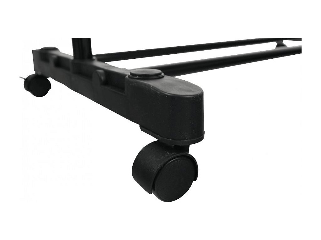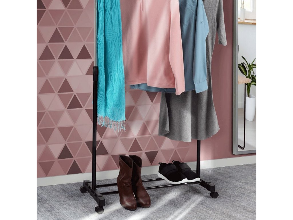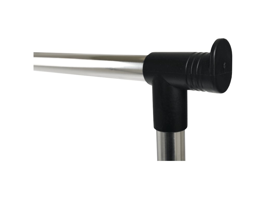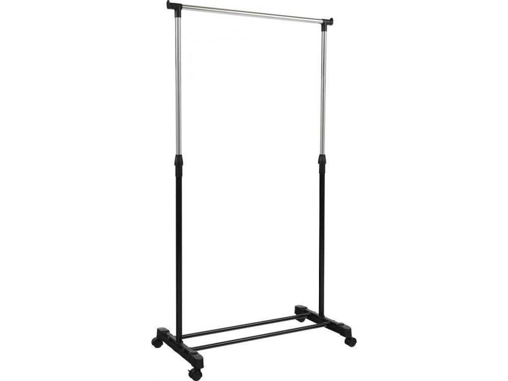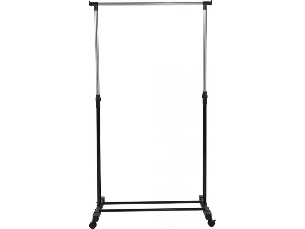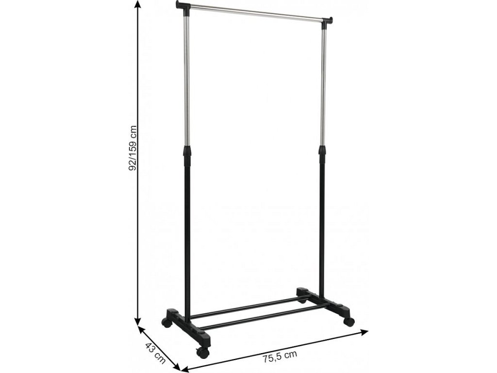 pojazdný věšák s kolečky a jednou závěsnou výškově nastavitelnou tyčí, provedení: nerezový kov + černý plast, rozměry ŠxHxV: 75,5x43x92-159 cm