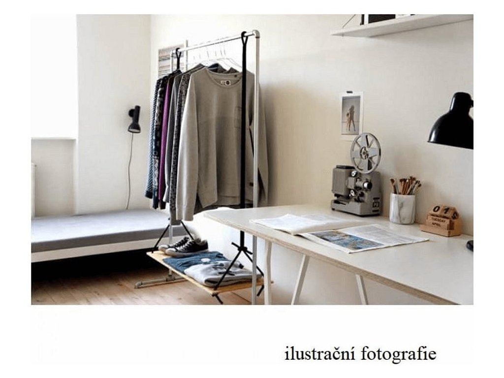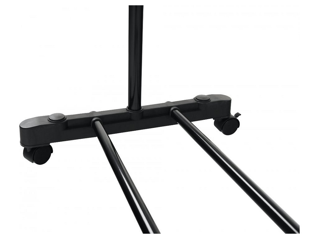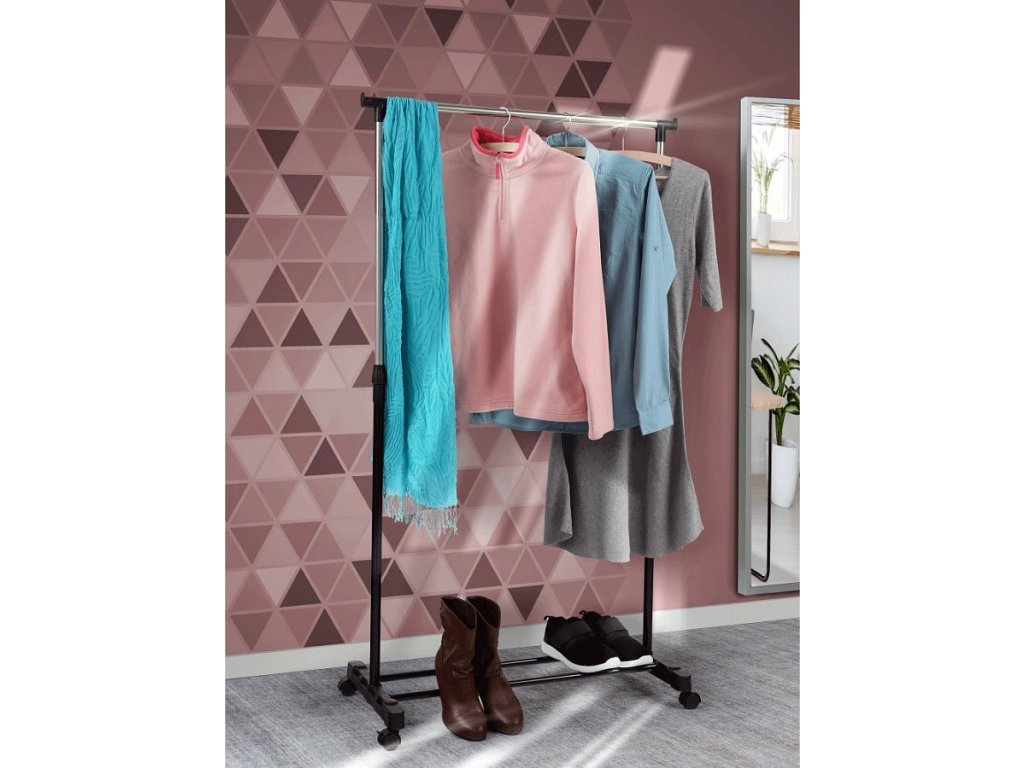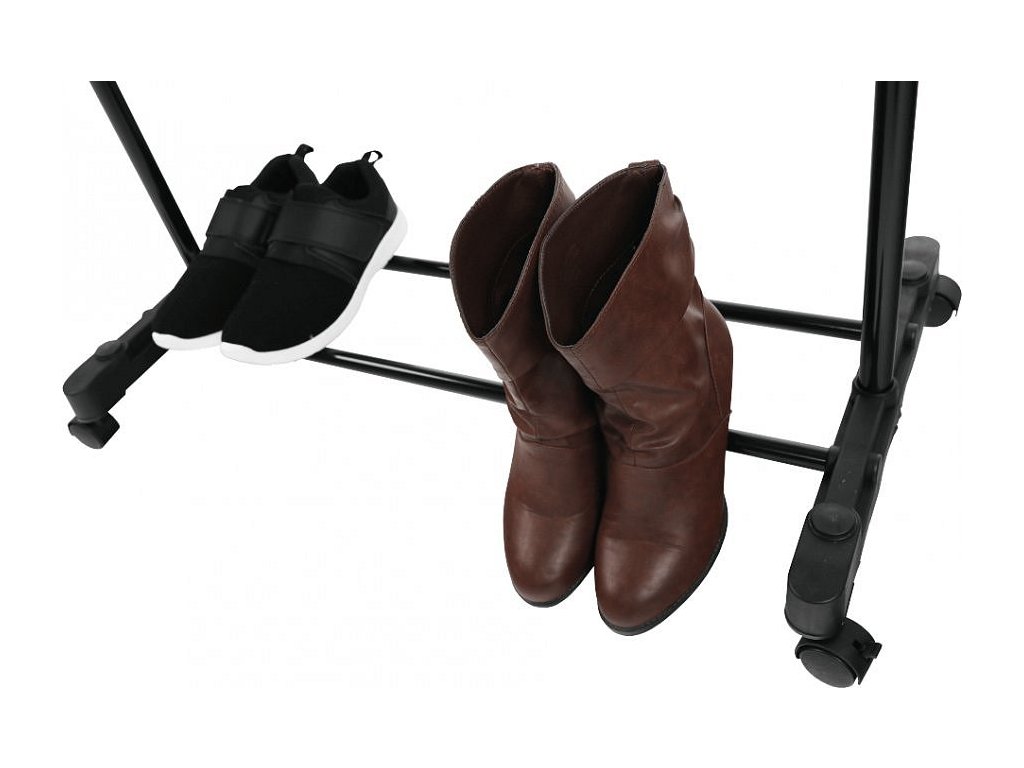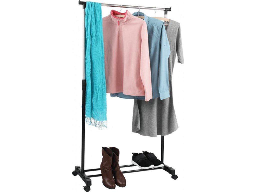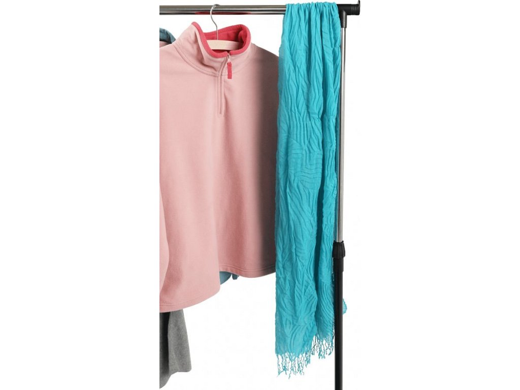 pojazdný věšák s kolečky a jednou závěsnou výškově nastavitelnou tyčí, provedení: nerezový kov + černý plast, rozměry ŠxHxV: 75,5x43x92-159 cm