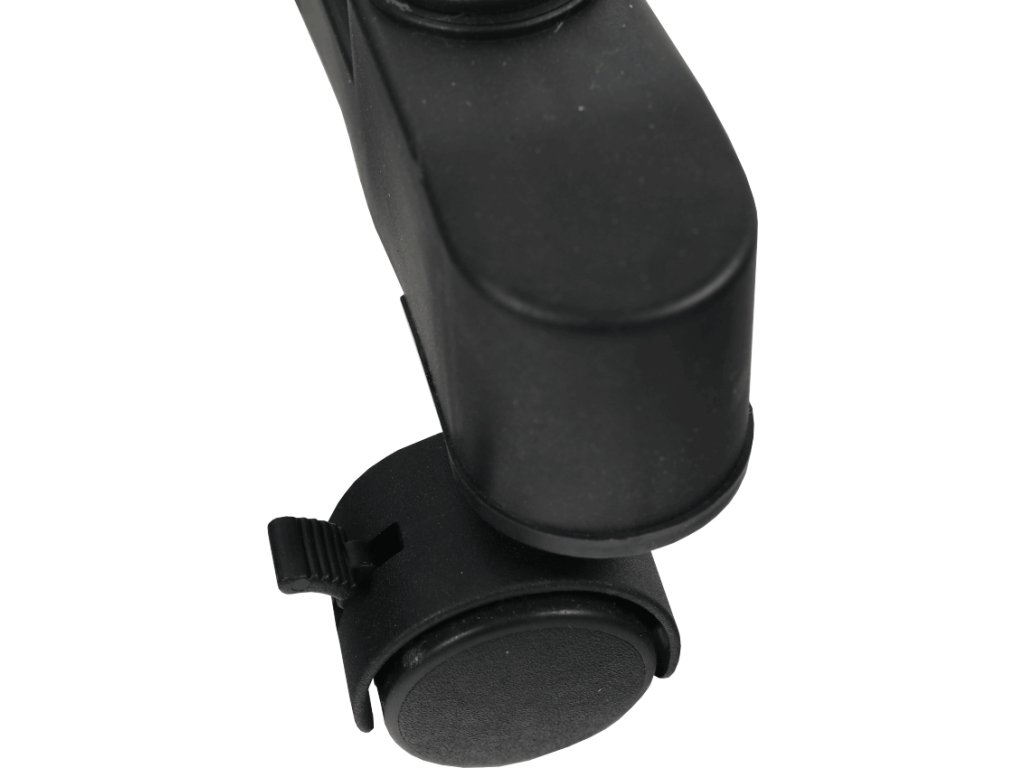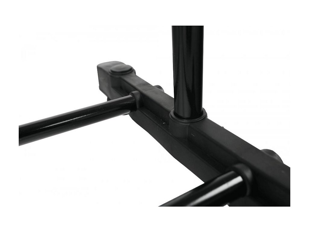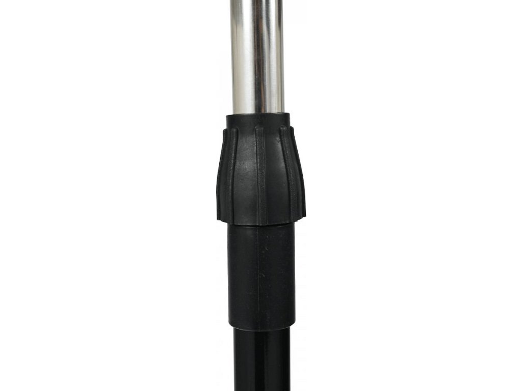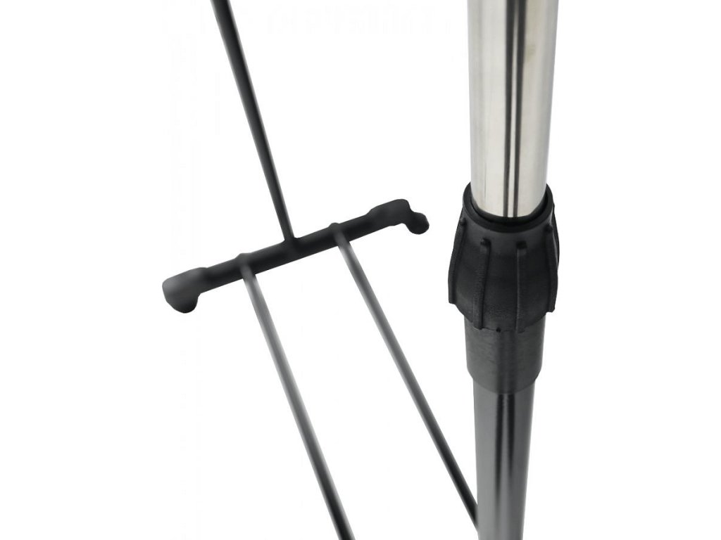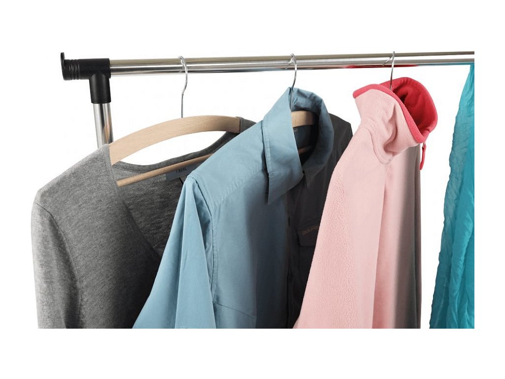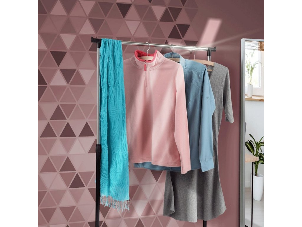 pojazdný věšák s kolečky a jednou závěsnou výškově nastavitelnou tyčí, provedení: nerezový kov + černý plast, rozměry ŠxHxV: 75,5x43x92-159 cm