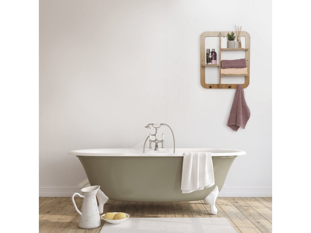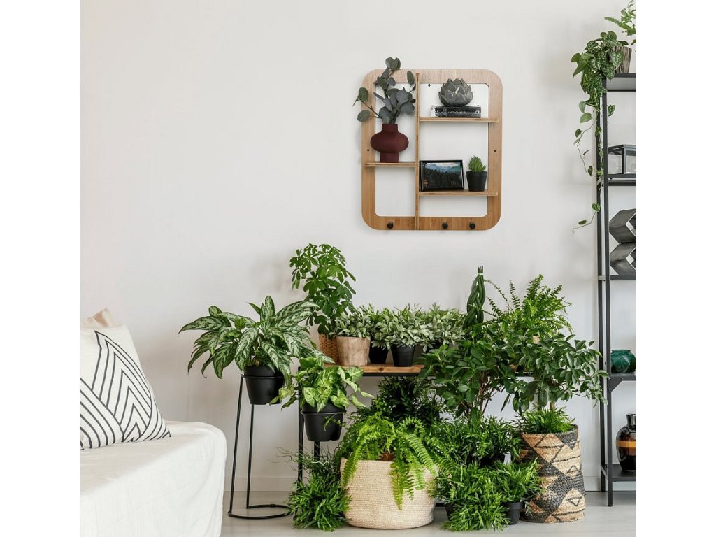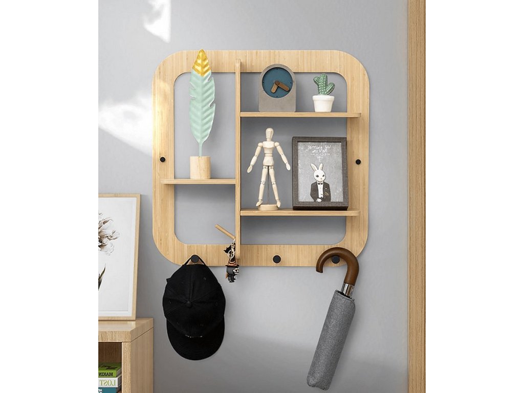 Materiál: bambus lakovaný Barva: přírodní Rozměry (ŠxHxV): 52x10x59,5 cm tvar čtverce 4 háčky tři poličky Nosnost: 10 kg
