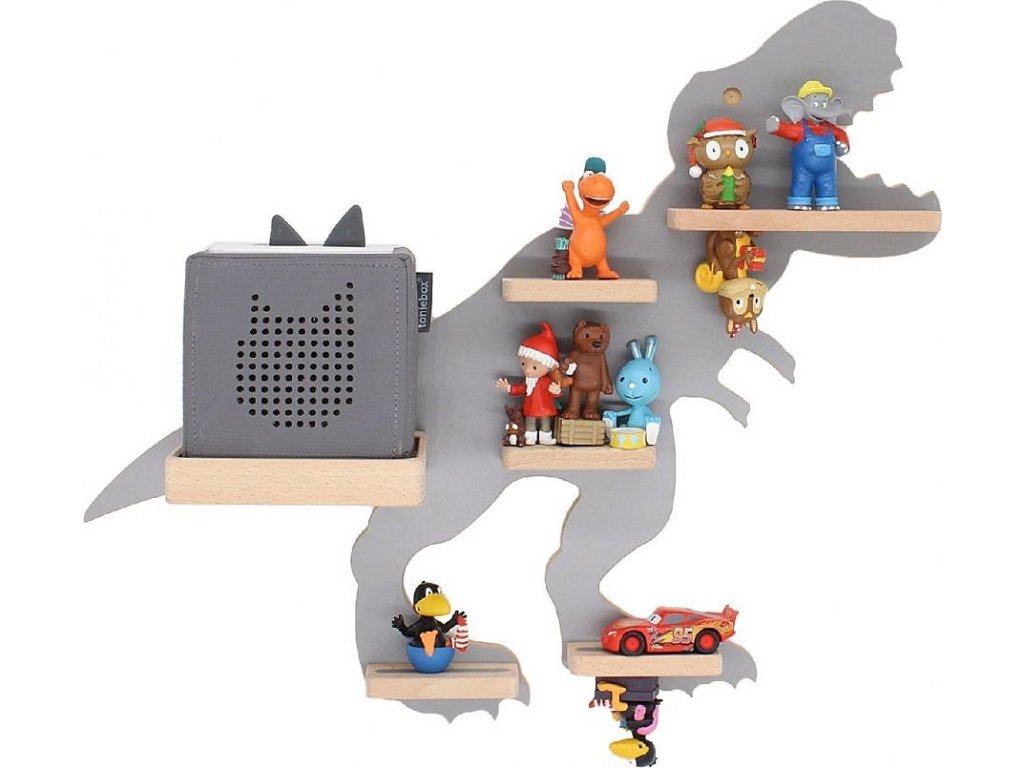 BOARTI - police pro Toniebox a cca 25 Tonies. Designér vyvinul tuto nástěnnou polici pro všechny fanoušky dinosaurů. Dinosaurus promění dětský pokoj v pravěkou džungli a nejenže dětem rozzáří oči. BOARTI s jedinečným designem - to je okamžitě jasné každému, kdo vlastní Toniebox a kolekci! Jasná nástěnka do dětského pokoje. Úhledná a stylová: zde nacházejí své místo nabíjecí stanice a figurky. Už žádné poletující figurky. Designér standardně integroval kovové lišty, které figurky bezpečně upevní k poličce a zajistí tak, aby zůstaly na místě. BOARTI je značka rodinné firmy VCM, která se od 70. let 20. století specializuje na design, výrobu a distribuci nábytku s férovým poměrem cena/výkon a již zkrášlila miliony domácností.