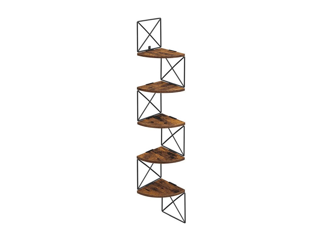 Nástěnná rohová police v dekoru old wood kombinuje teplé hnědé odstíny MDF desek s černým kovovým rámem, který zajišťuje stabilní upevnění a zajímavý industriální vzhled. Police je tvořena pěti segmenty ve tvaru čtvrtkruhu, které jsou navzájem propojeny kovovými prvky s křížovým vzorem, což přispívá k pevnosti a zároveň vytváří vzdušný design. Rozměry 127,5 × 20 cm umožňují efektivní využití rohových prostorů pro vystavení dekorací či drobných předmětů. Povrch MDF desek je upraven tak, aby připomínal strukturu starého dřeva, což dodává policím rustikální charakter. Díky kombinaci materiálů a konstrukčnímu řešení je police vhodná do moderních i vintage interiérů.