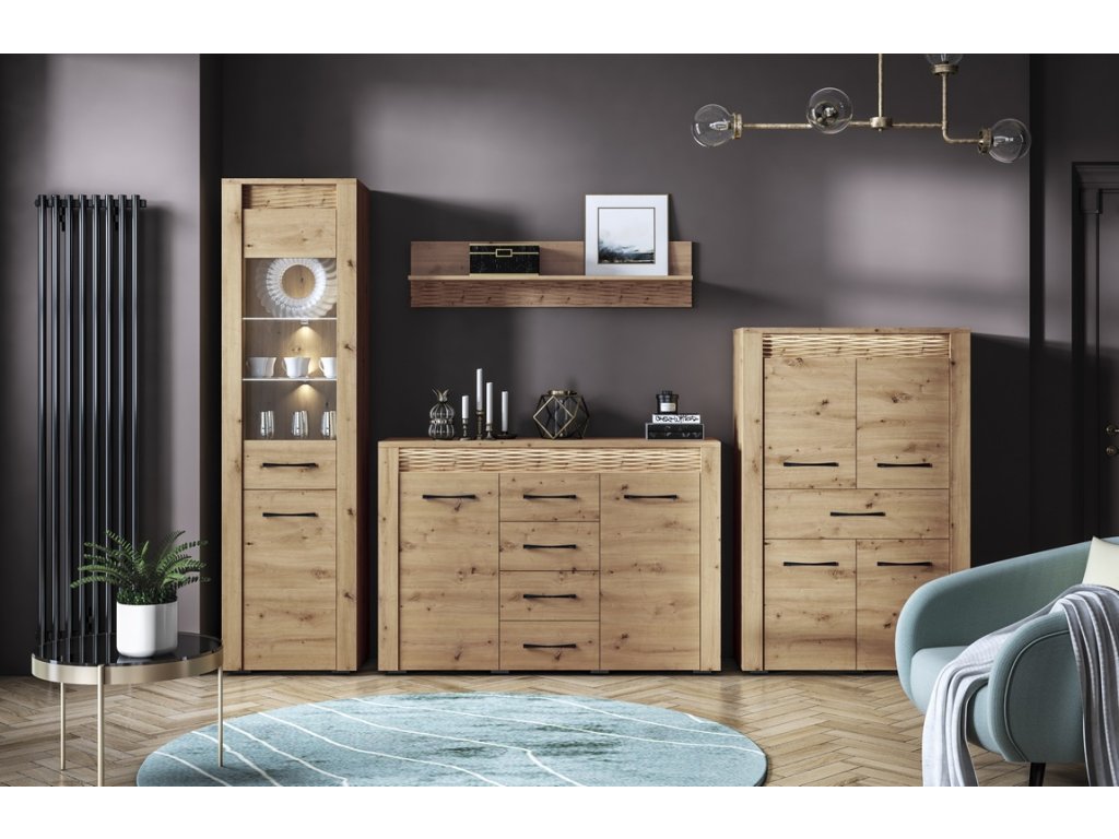 CASA 56004 Policová skříň dvoudveřová je vyrobena z kvalitní desky LTD hraněné ABS páskou v barvě dub artisan. Dekorační riflovaná lišta nahoře je z MDF. Dvířka jsou vybaveny systémem tichého dovírání a je možné je namontovat na pravou nebo levou stranu. Úchyty jsou kovové černé. Dodáváme v demontovaném stavu.