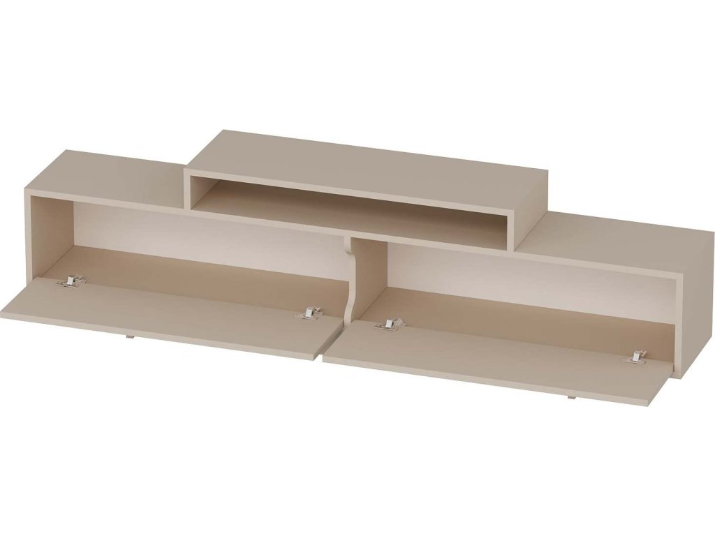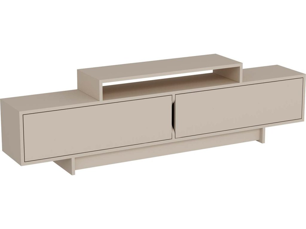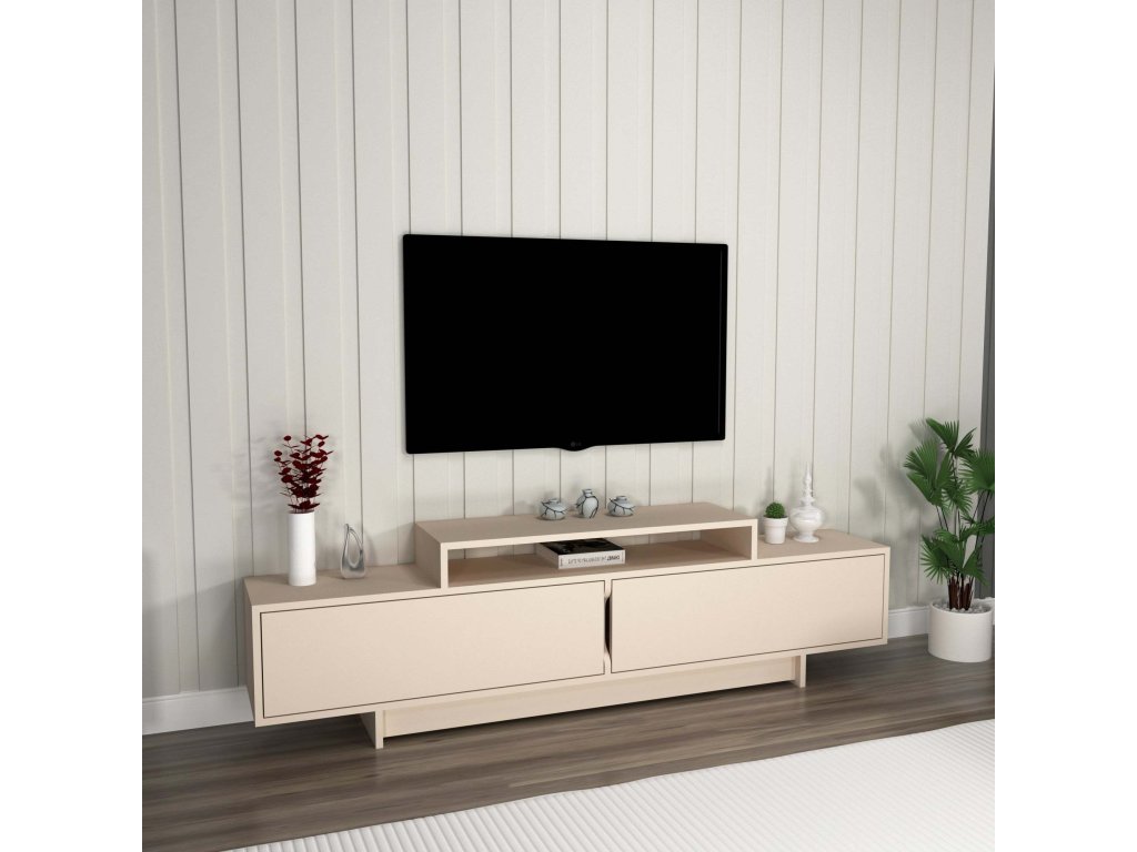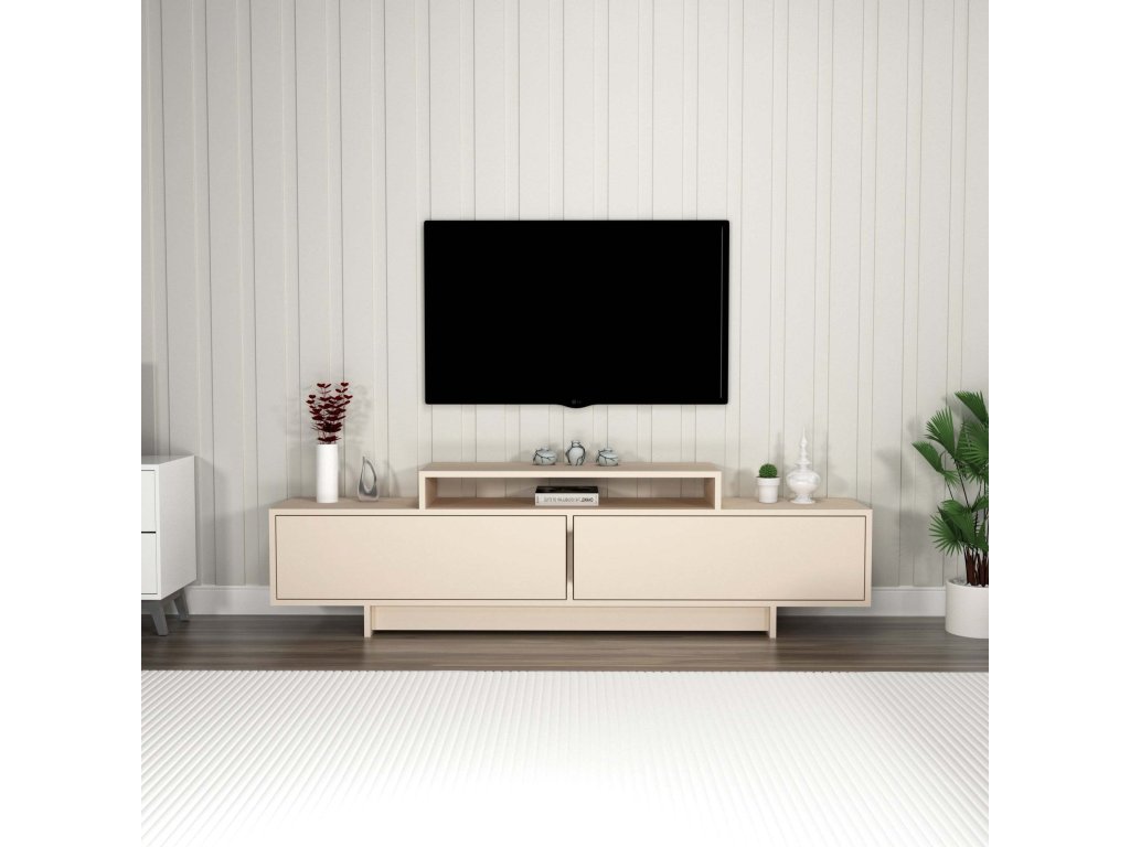 TV stolek je ideální volbou pro každého, kdo hledá stylový a funkční doplněk do obývacího pokoje. Díky kombinaci plných dvířek a regálků poskytuje dostatek prostoru pro uložení elektroniky, příslušenství nebo dekorací. Jeho čistý a elegantní design snadno zapadne do moderního interiéru.