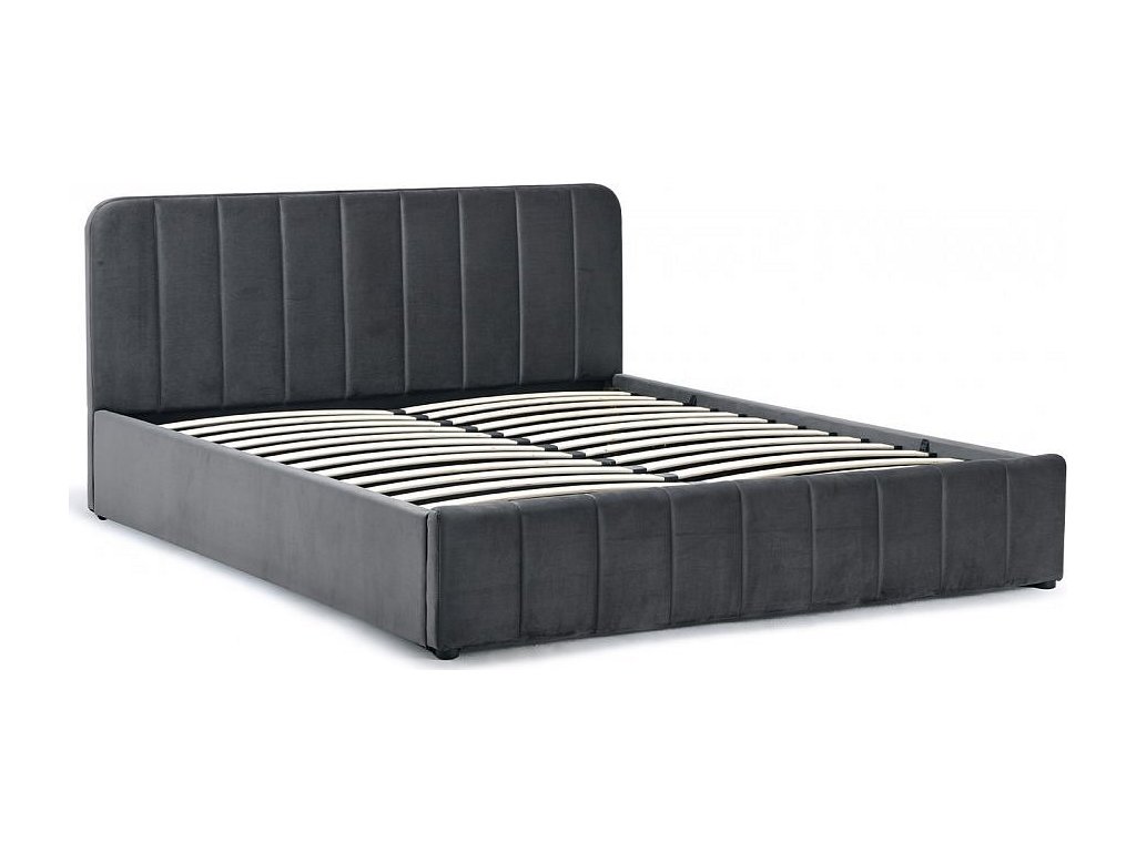 Čalouněná postel s úložným prostorem, překližka s pěnovou výplní a sametovým potahem, ocelový rám s hydraulickým zvedáním.
