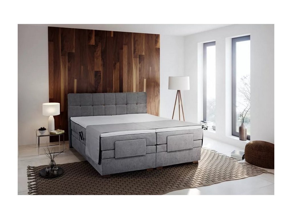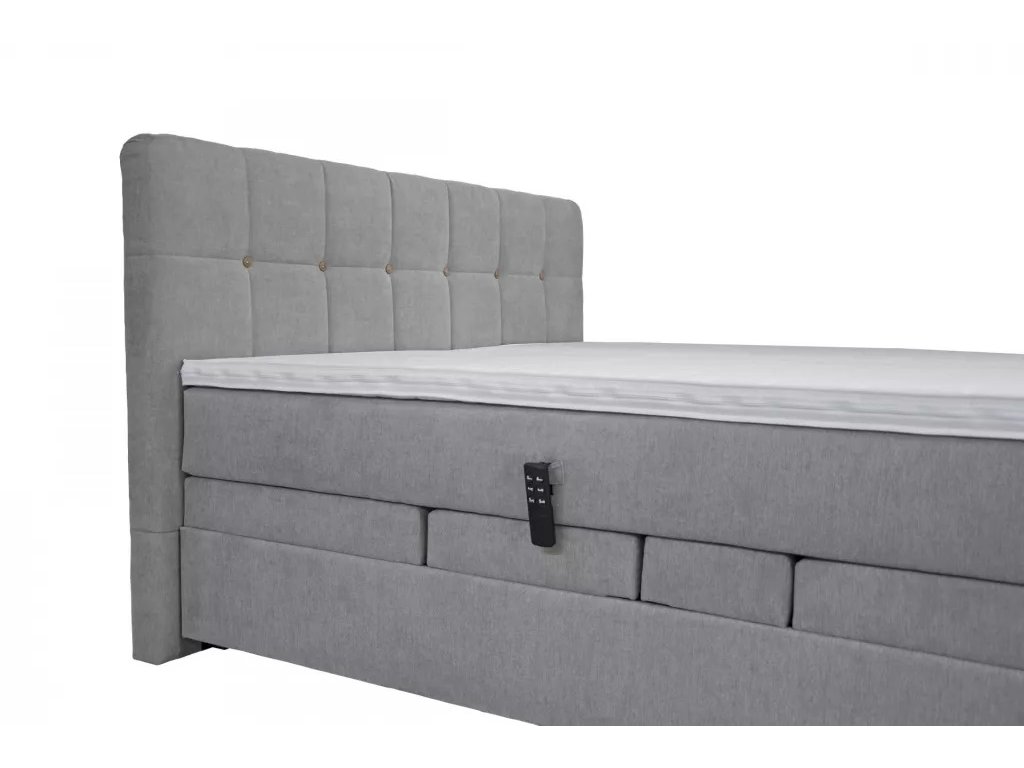 Luxusní motorový boxspring Samael je možno polohovat za pomoci bezdrátového ovladače. V čele postele jsou ve vtazích upevněny knoflíky. První vrstvou postele je jádro tvořené taštičkovými pružinami, které je uloženo uvnitř boxu, který u lůžek typu boxspring nahrazuje lamelový rošt. Vysoké množství malých pružin je samostatně uloženo v textilních taštičkách, které zajišťují výborné kopírování těla uživatele Tento podklad matrace dokáže bodově lépe reagovat než většina lamelových roštů. Druhou vrstvou jsou volně ložené matrace tvořené jádrem z taštičkových pružin, které jsou vhodné pro postele typu boxspring. Jádro se skládá z vysokého množství malých pružin samostatně uložených v textilních taštičkách, které zajišťují výborné kopírování těla uživatele. Rozložení a množství pružin totiž podepírá páteř lépe než běžné pružinové matrace. Boky matrace jsou očalouněné v kvalitní potahové látce . Celková výška matrace v potahu je 18 cm. Postel bude dodána v potahové látce, která je vyobrazena na druhé fotografii.