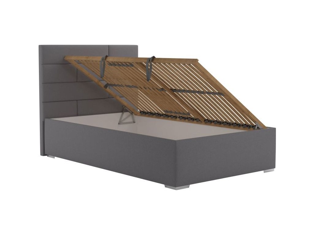 Moderní postel, která se hodí nejen do studentských nebo dětských pokojů, ale také do menších ložnic. Základem lůžka je pevný lamelový rošt s nastavením tuhosti lamel a s popruhem proti přetížení. Rošt se skládá z 28 lamel uložených ve výkyvných kaučukových pouzdrech. Snadnější manipulaci při otevírání úložného prostoru zajišťují pružinové mechanismy. Matrace není součástí postele. Součástí postele je úložný prostor, který se otevírá z boku postele. Tuto postel nabízíme také v dalších rozměrech. Postel je možné zakoupit také s matrací. Zboží je dodáváno v demontu.