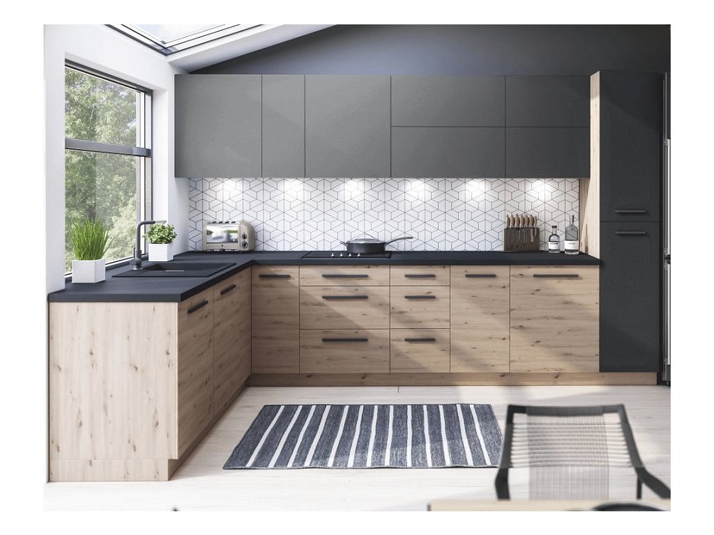 Cena sektorových skříněk je uváděna bez pracovní desky a spodní lišty. Cena za pracovní desku dub artisan je 1490 Kč / bm - tloušťka 38 mm, cena za pracovní desku černý vulkán je 1680 Kč / bm - tloušťka 38 mm. Možnost dokoupení spodní lišty dub artisan v rozměru 1 m za cenu 240 Kč nebo v rozměru 2 m za cenu 360 Kč. Ke každé dolní skříňce je nutné doobjednat 2 ks úchytů na sokl cena 20Kč / 2 ks.