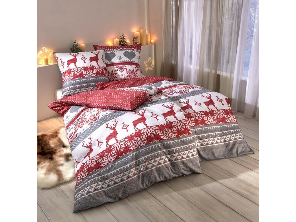 Kouzelní sobi na dalekém severu! Toto ložní prádlo z mikrovlákna v norském stylu se soby zajistí útulné zimní noci - je úžasně měkké a hřejivé. Se zipem. Lze prát při 30 °C. Mikrovlákno. Šetrné k pokožce + prodyšné. Snadná údržba + nemusí se žehlit. Eldo.