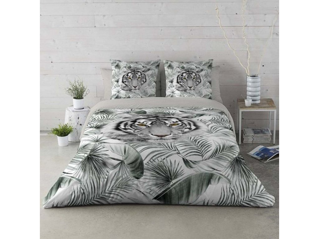 Pro exotický vzhled Vaší ložnice zvolte povlečení s originálním potiskem džungle a tygra. Přirozeně jemný a odolný materiál. Pevná a pravidelná tkanina. Povlak na polštář: 2 stejné strany se středovým potiskem. Povlak na přikrývku: 2 odlišné strany, 1 strana se středovým potiskem, 1 strana sladěná jednobarevná. V typicky francouzském stylu ve tvaru lahve pro zasunutí konce pod matraci. Standard 100 podle Oeko-Tex (n° CQ 1216 / 1 IFTH). Tato známka označuje textilní výrobky, které byly podrobeny laboratorním testům na široké spektrum škodlivých látek a výrobek je bezpečný nad rámec platných norem. Perte na 30 °C.