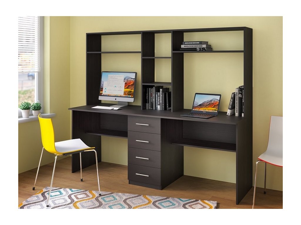 CASA 19012 Praktický pracovní stůl se dvěma pracovními plochami a policovým nástavcem je vyroben z LTD desky odolné vůči poškrábání v barvě wenge. Stůl je uprostřed rozdělen čtyřmi zásuvkami. Výška stolu včetně nástavce je 152 cm, hloubka nástavce je 30 cm. Výška pracovní plochy je 76,5 cm. Dodáváme v demontovaném stavu.