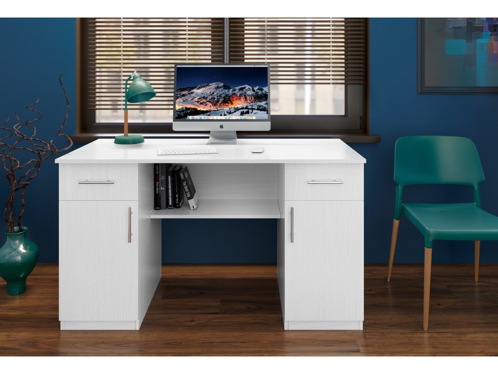 CASA 19004 Praktický pracovní stůl je vyroben z LTD desky odolné vůči poškrábání v barvě bílá strukturální. Stůl má na každé straně skříňku a nad ní zásuvku. Dodáváme v demontovaném stavu.