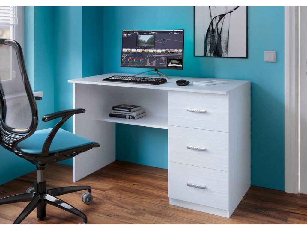 CASA 19005 Praktický pracovní stůl je vyroben z LTD desky odolné vůči poškrábání v barvě bílá strukturální. Stůl má na pravé straně tři zásuvky. Dodáváme v demontovaném stavu.