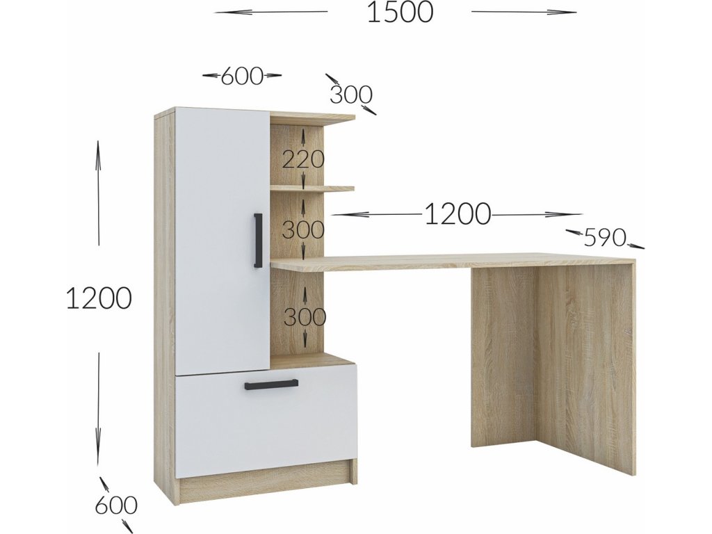 CASA 83077 Praktický pracovní stůl pravý. Pracovní stůl proveden v jednoduché linii, který se hodí do moderního interiéru. Je vyroben z LTD desky odolné vůči poškrábání v barvě dub sonoma v kombinaci s matnou bílou (nymphaea alba). Spodní skříňka je výklopná. Rozměry viz perokresba .Dodáváme v demontovaném stavu.
