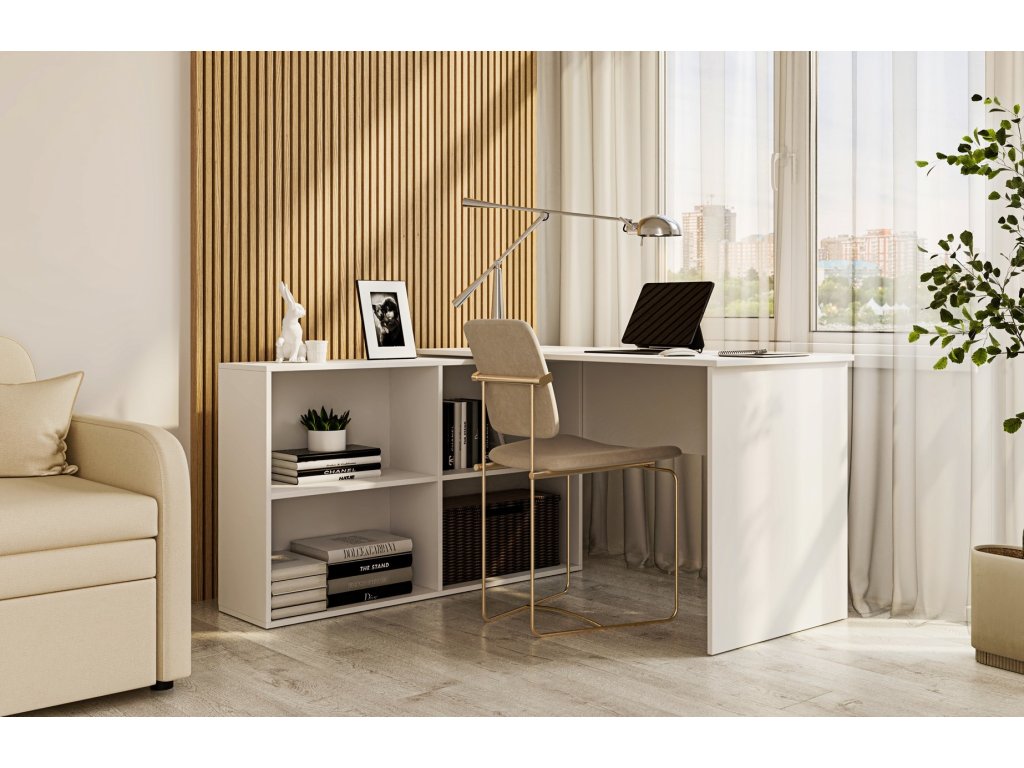 Sestává ze samotného stolu a regálu předěleného na čtyři částí vyrobený z desky LTD v barvě matná bílá.